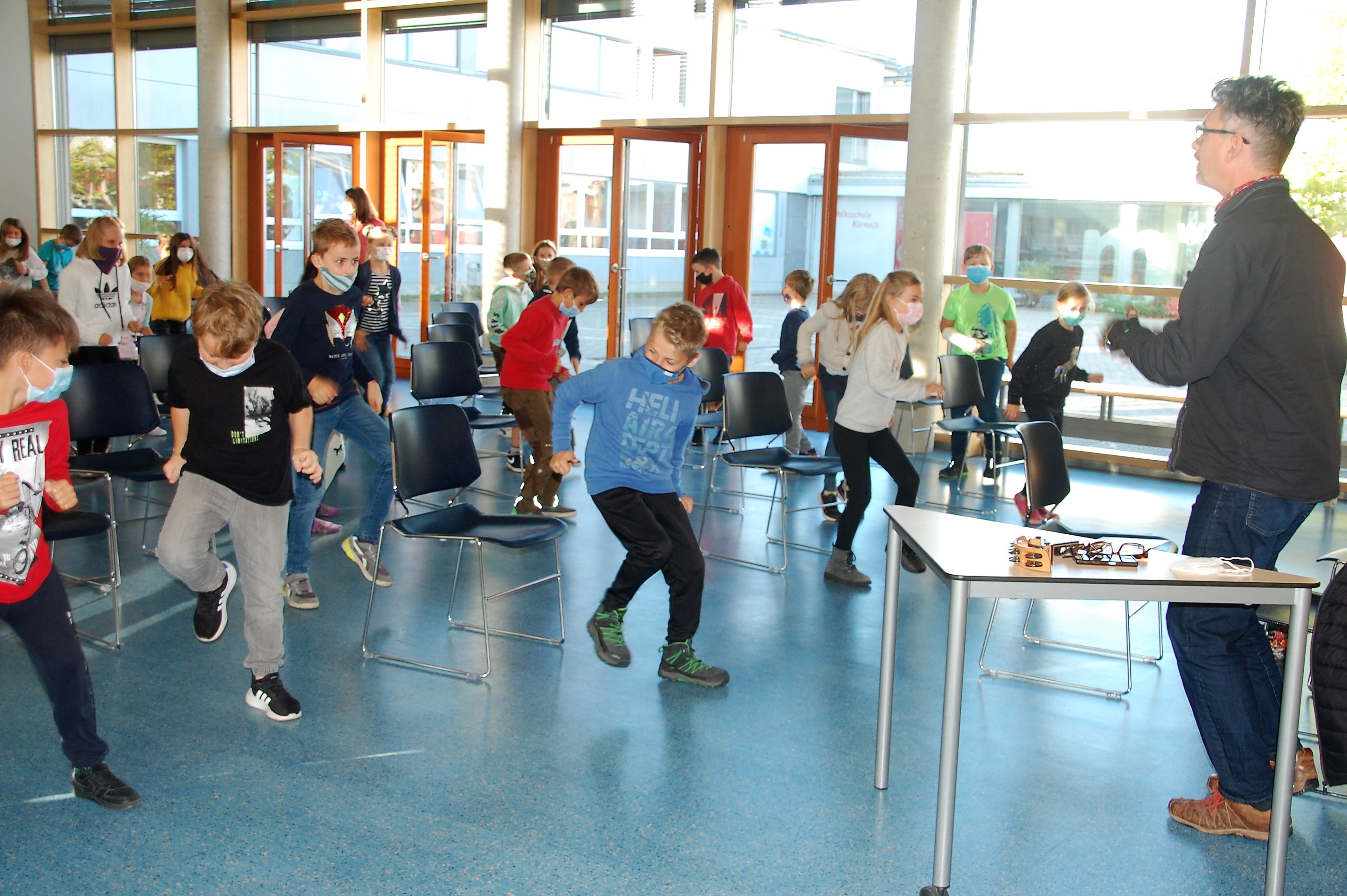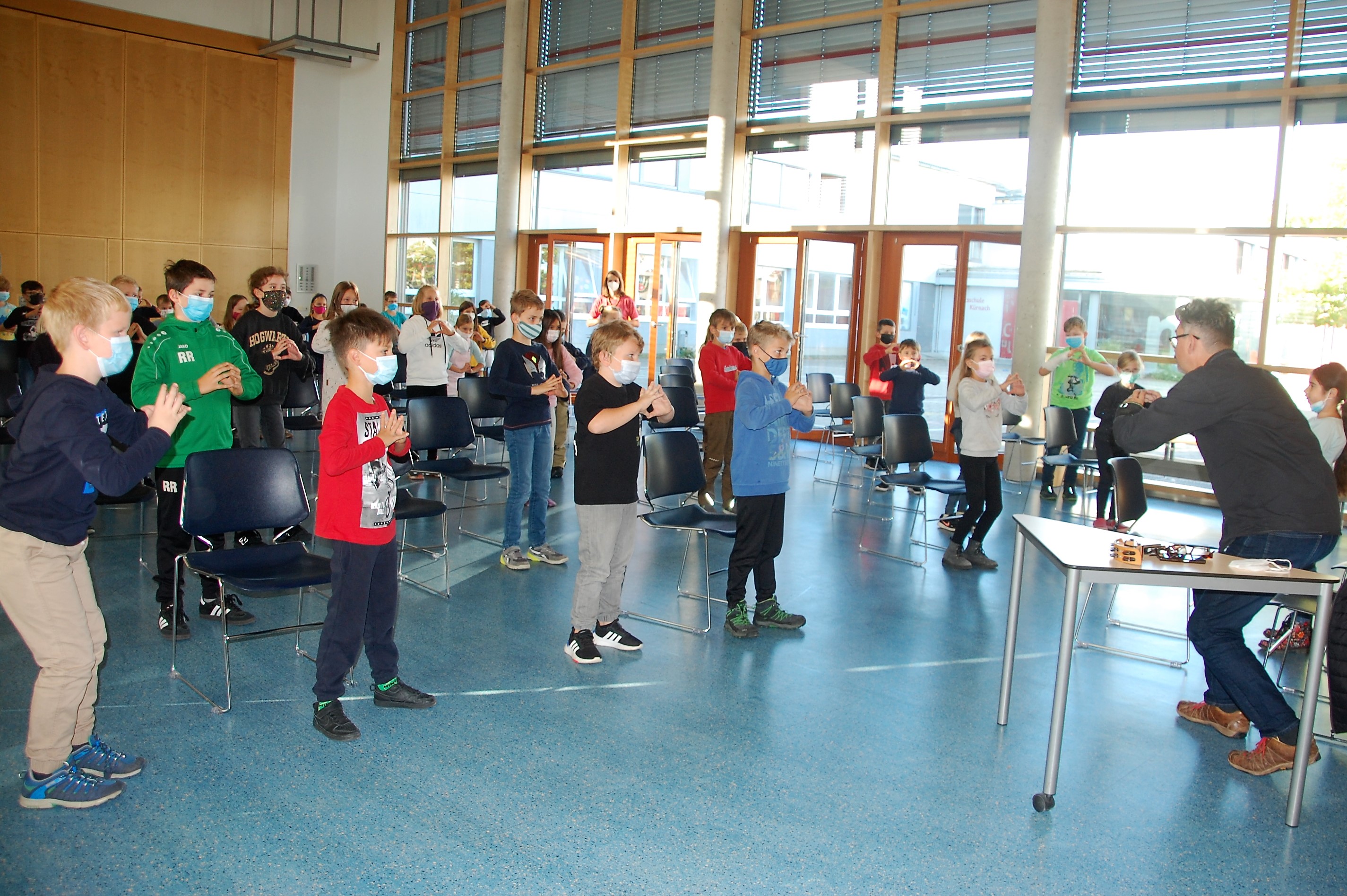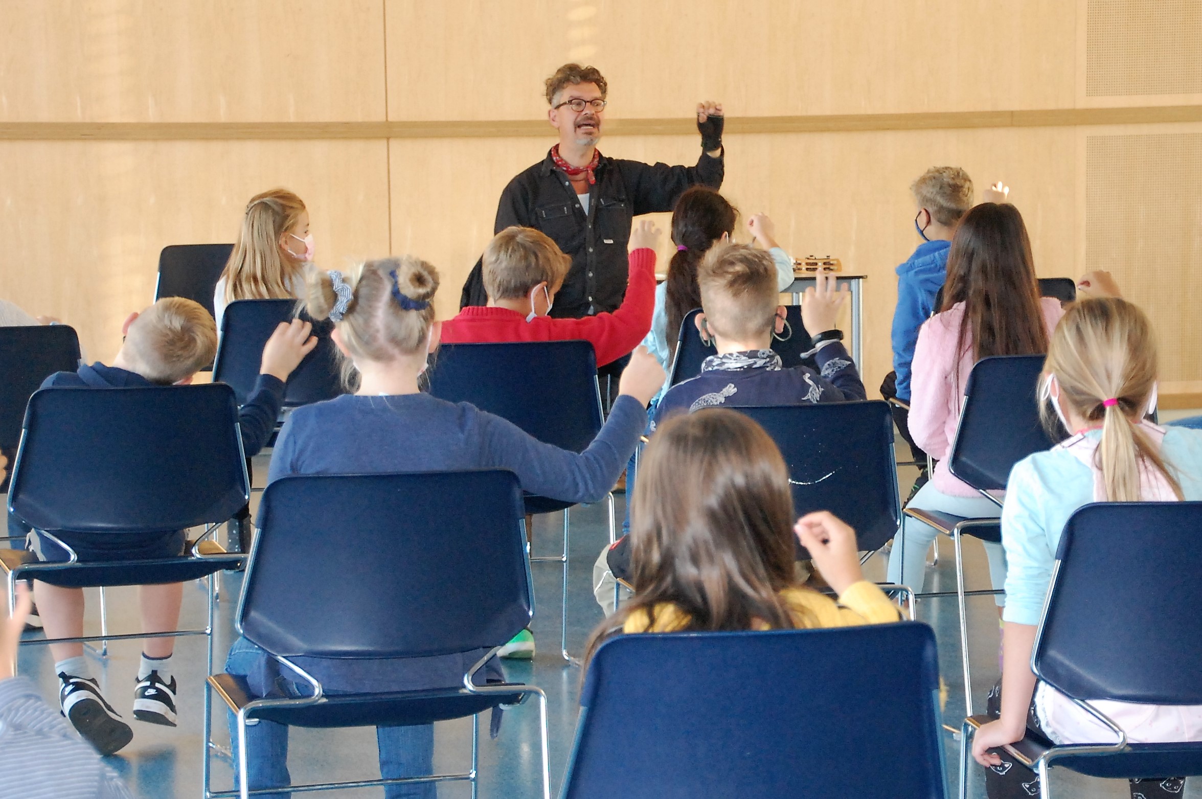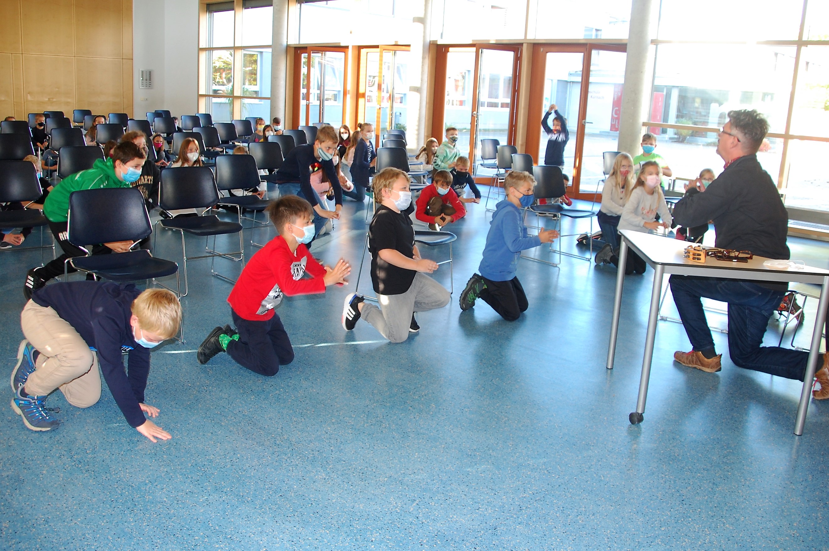 Christian Seltmann lud zu einer Hörspielaufnahme seines Buches Kommissar Ping ein. Die Kinder durften dabei den Part der Geräusche übernehmen. Alle Handlungen im Freien wurden mit leisem Summen begleitet. Fortbewegungen mit Krabbeln der Finger oder Fäuste auf dem Stuhl, sowie Staunen und Schnalzen mit dem Kaugummi wurden eingeübt. Nach einigen Auflockerungsübungen und frischer Luft wurde es ernst und die Aufnahme begann. Seltmann spiele mit der Mundharmonika die musikalische Einstimmung und die Zwischenmoldien und las die Geschichte. Dazu kamen die Hintergrundgeräusche, für die die Kinder zuständig waren. Aufmerksam und gespannt hörten die Kinder die Geschichte und führten die jeweiligen Einsätze perfekt aus. Über eine gelungene Aufnahme können sich nun die Schülerinnen und Schüler mit ihren Lehrkräften freuen. Der Dank gilt dem Landratsamt Würzburg für die finanzielle Unterstützung und der Bücherei Kürnach, die dieses Angebot möglich machte.