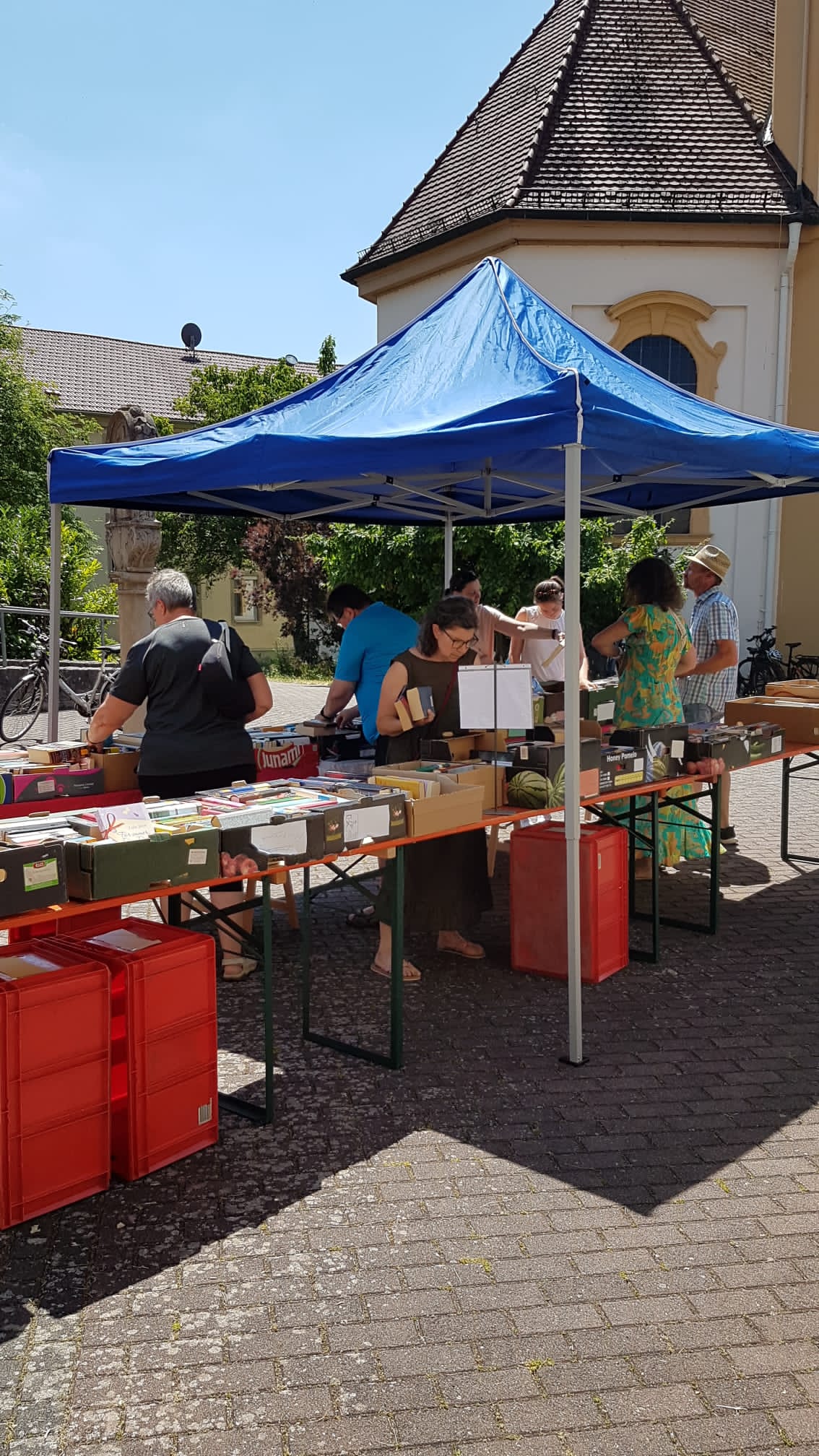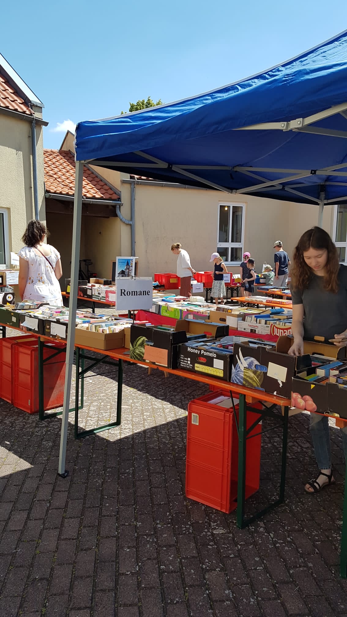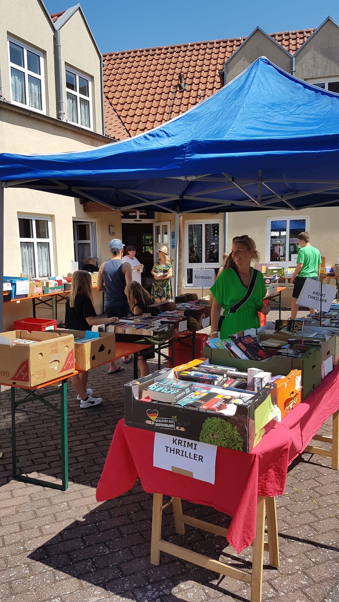 Das war ein Räkeln und sich Breitmachen auf den Tischen und Bänken, die vor der Bücherei aufgebaut waren. Die Kinderbücher warteten gespannt darauf, von unseren jungen Leserinnen und Lesern, durchgeblättert zu werden. Romane und Krimis hatten es sich unter einem Pavillon gemütlich gemacht und Sach-, Koch-, Reise- und Schulbücher harrten der Dinge, die auf sie zukamen.