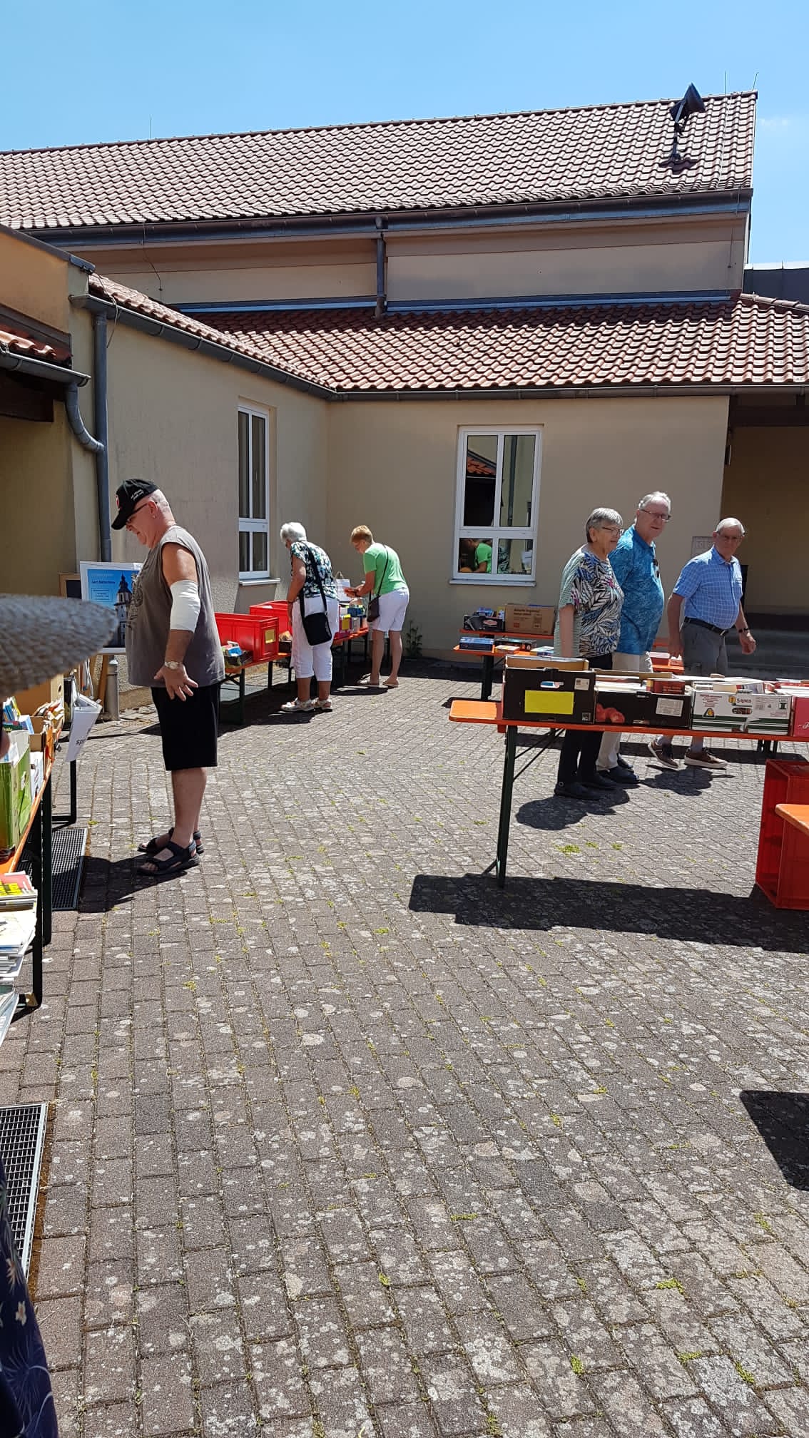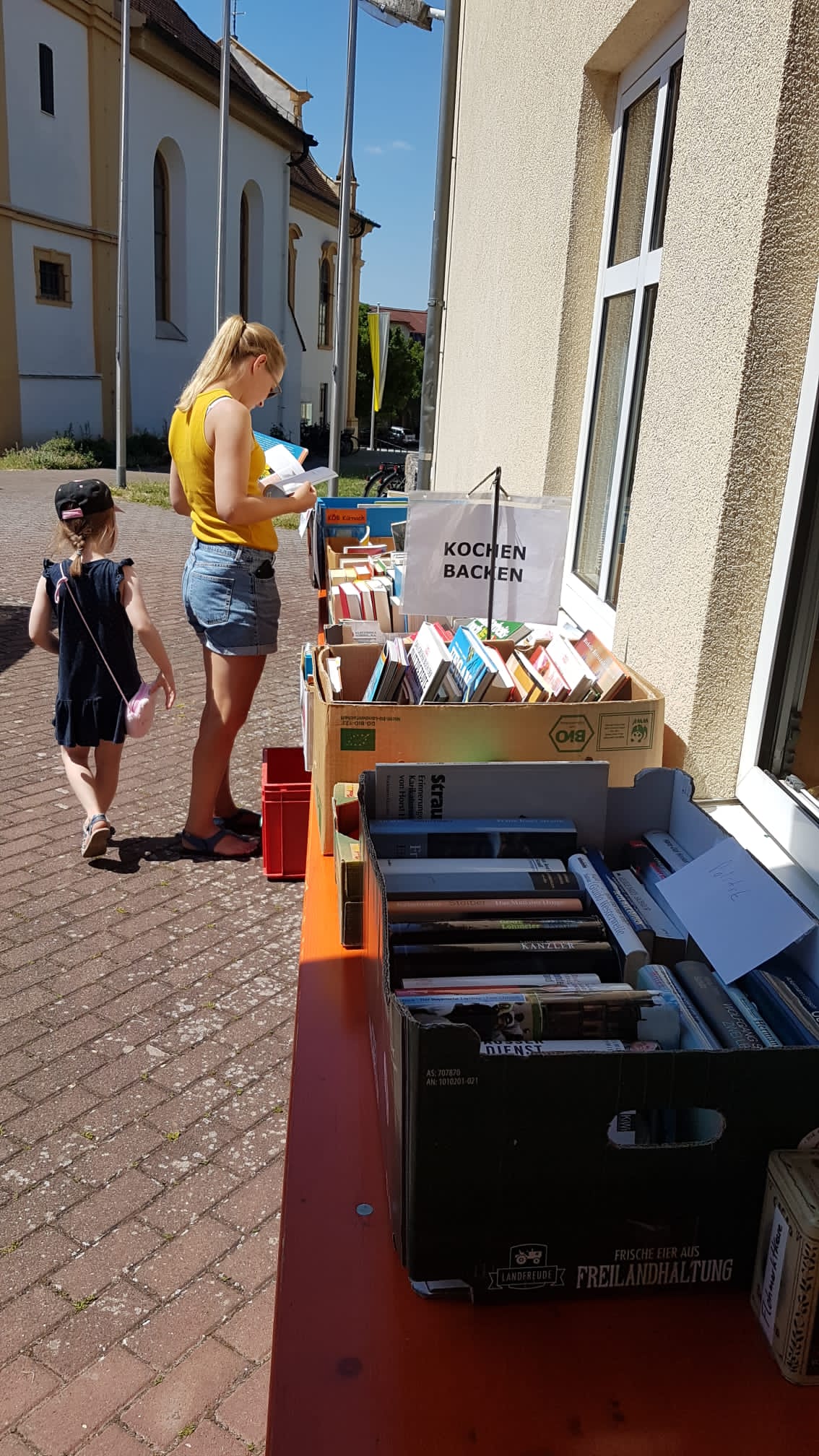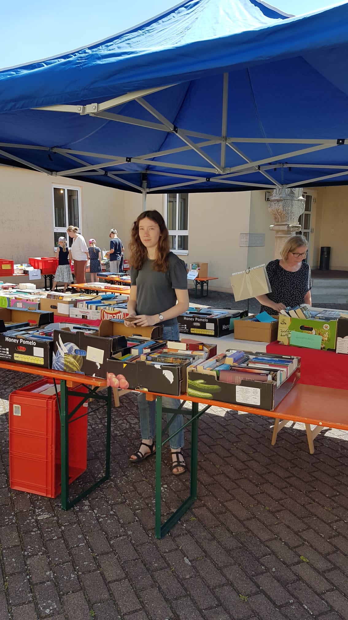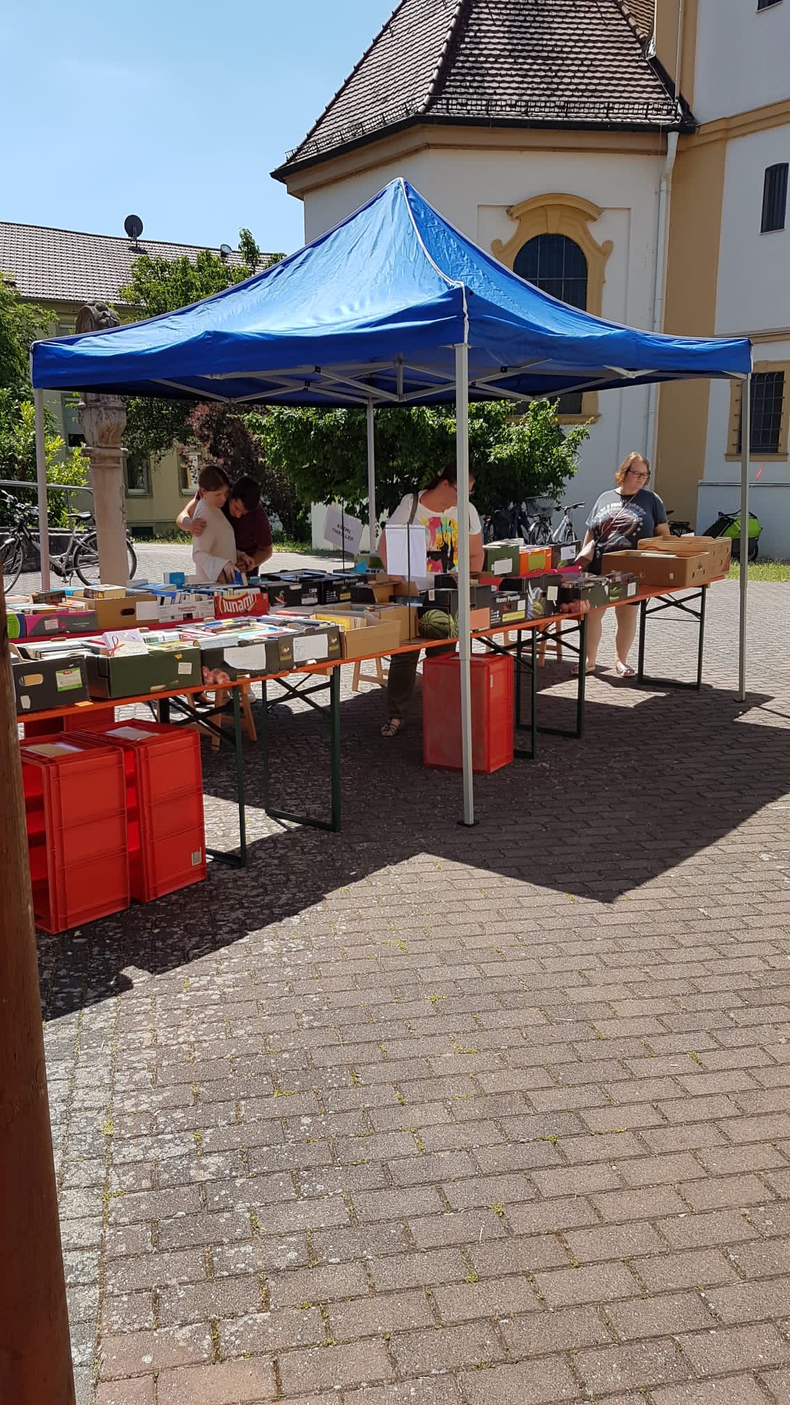 Das war ein Räkeln und sich Breitmachen auf den Tischen und Bänken, die vor der Bücherei aufgebaut waren. Die Kinderbücher warteten gespannt darauf, von unseren jungen Leserinnen und Lesern, durchgeblättert zu werden. Romane und Krimis hatten es sich unter einem Pavillon gemütlich gemacht und Sach-, Koch-, Reise- und Schulbücher harrten der Dinge, die auf sie zukamen.