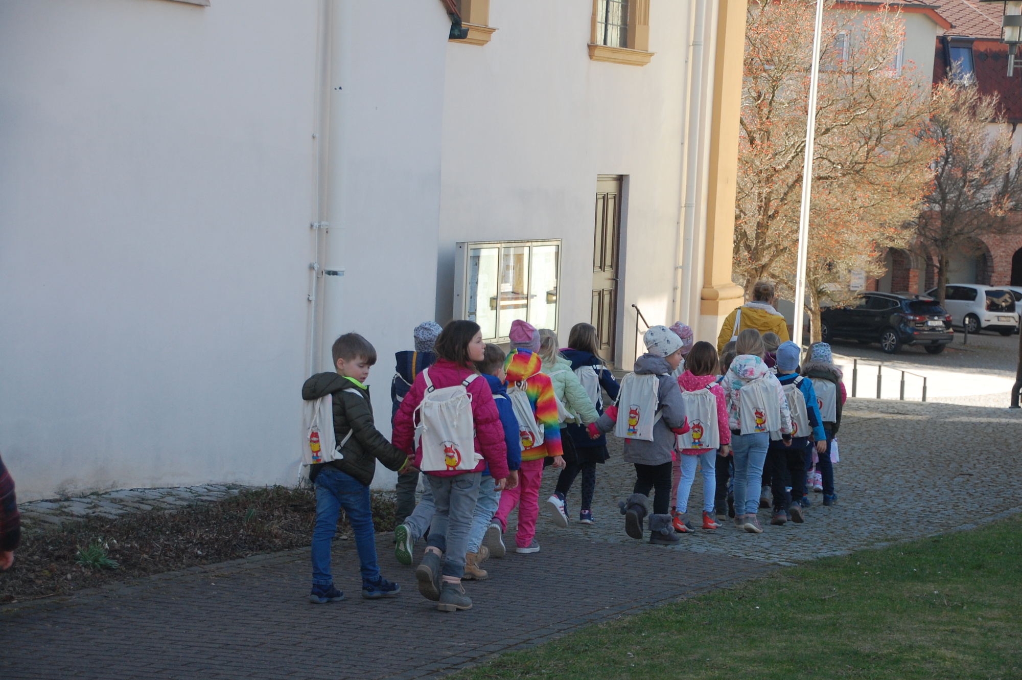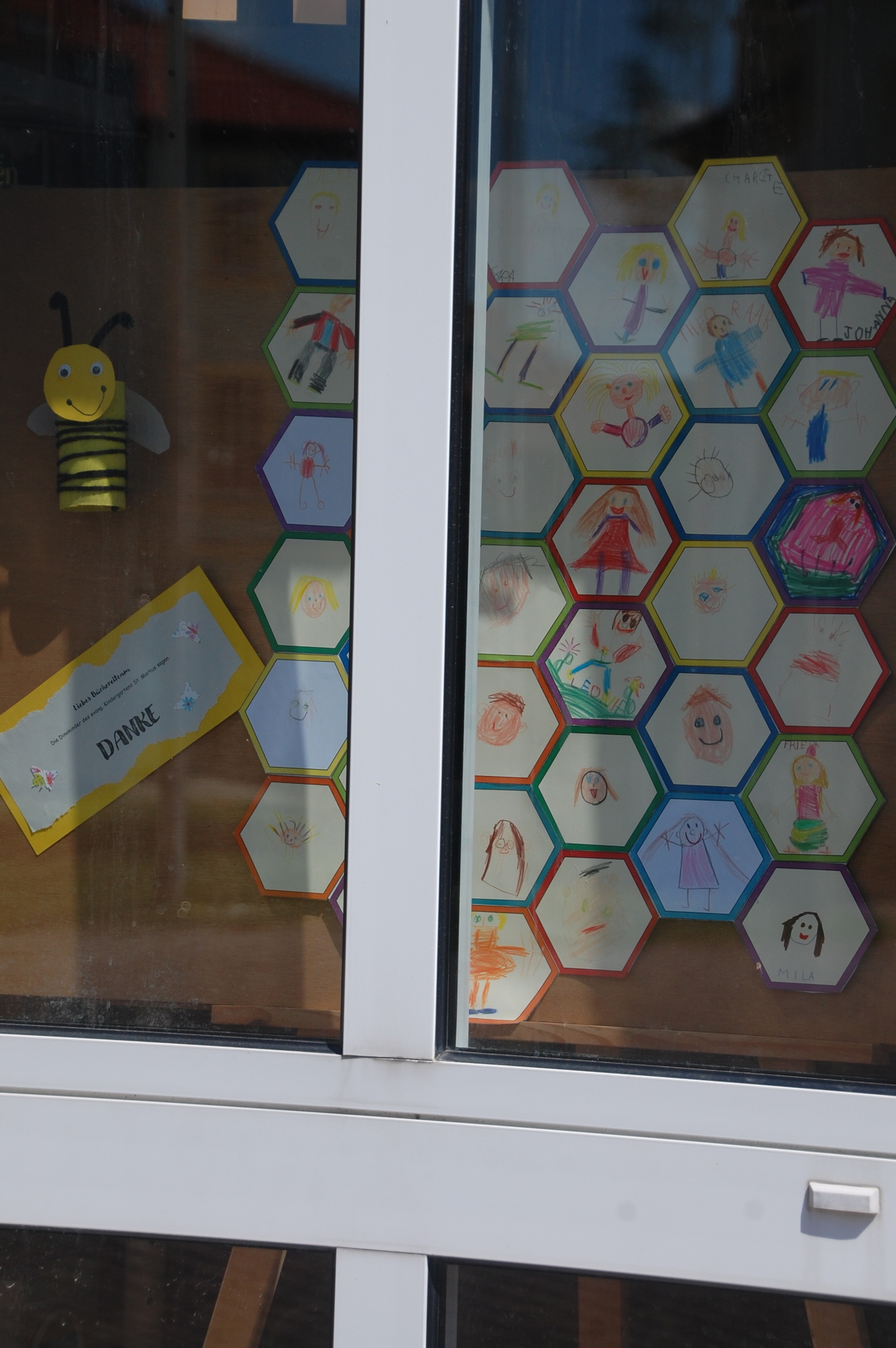 Bei ihren drei Besuchen haben sie die Medien und Regeln der Bibliothek kennengelernt. Im Bereich Sachbuch hat ihnen Marion Koeppe viel über Bienen erzählt und passende Bücher vorgestellt. Die Kinder durften an einer Honigwabe riechen und bekamen kleine ausgestochene Figuren aus einer Honigwabe geschenkt. Sie malten sich in die vorbereiteten Papierwaben, die nun zusammengefügt als Bild im Fenster der Bücherei zu sehen sind. Höhepunkt des dritten Besuchs war das Suchen und Finden der Bildausschnitte von den versteckten Büchern und das richtige Zuordnen mit Punkten auf dem Lösungsblatt. Das dann zu einem Buch gefaltete Blatt konnte sich jedes Kind mit nach Hause nehmen.