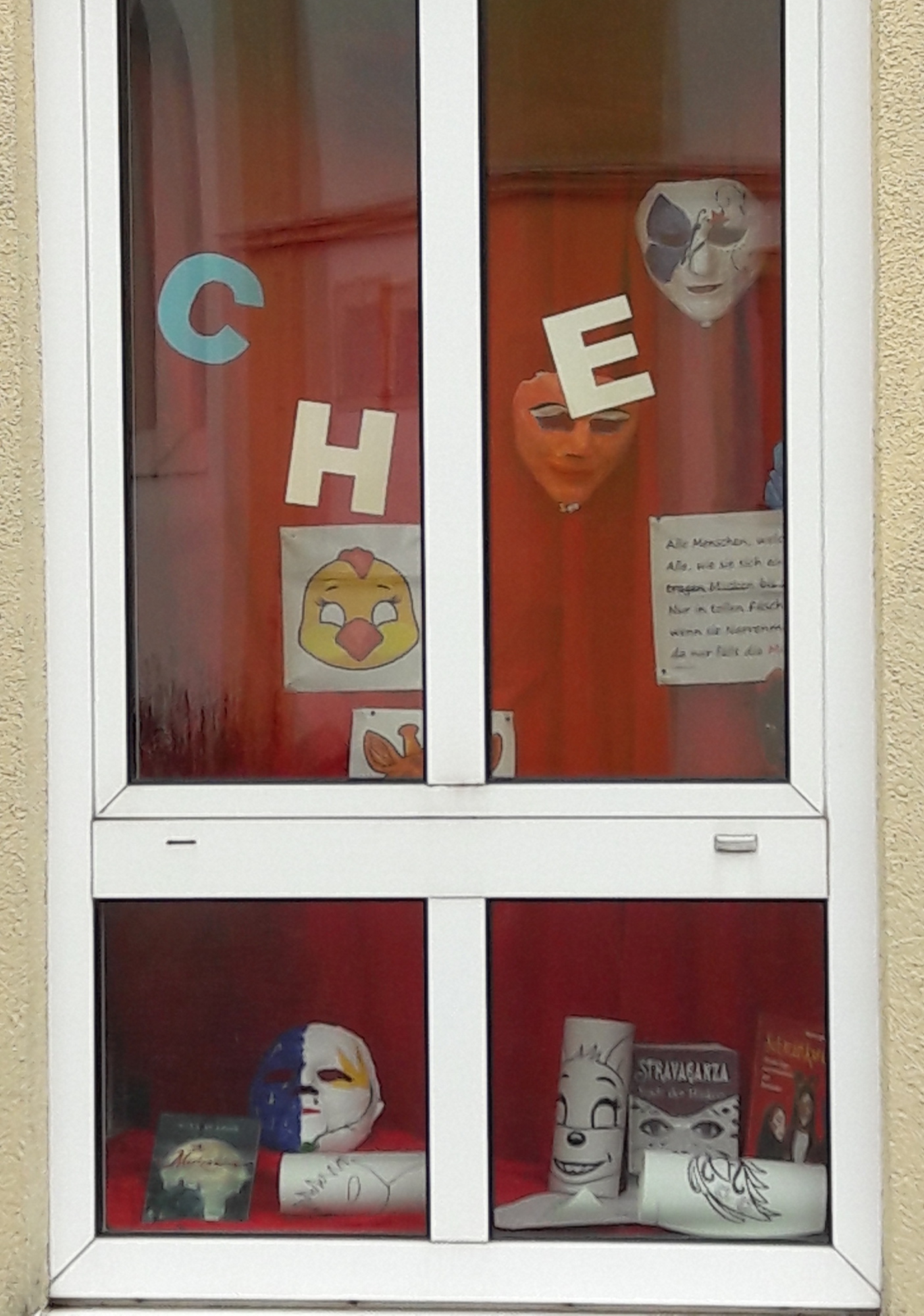 Im Fasching waren u. a. selbst gestaltete Masken, Vorlagen zum Ausmalen ganz verschiedener Masken sowie Bücher zum Thema Masken zu sehen.