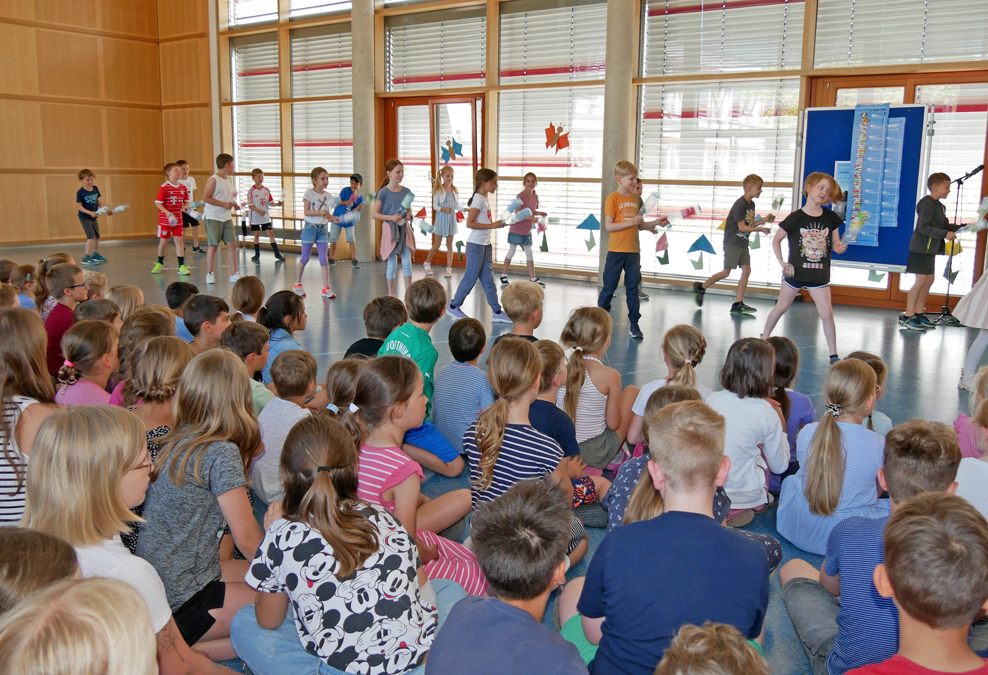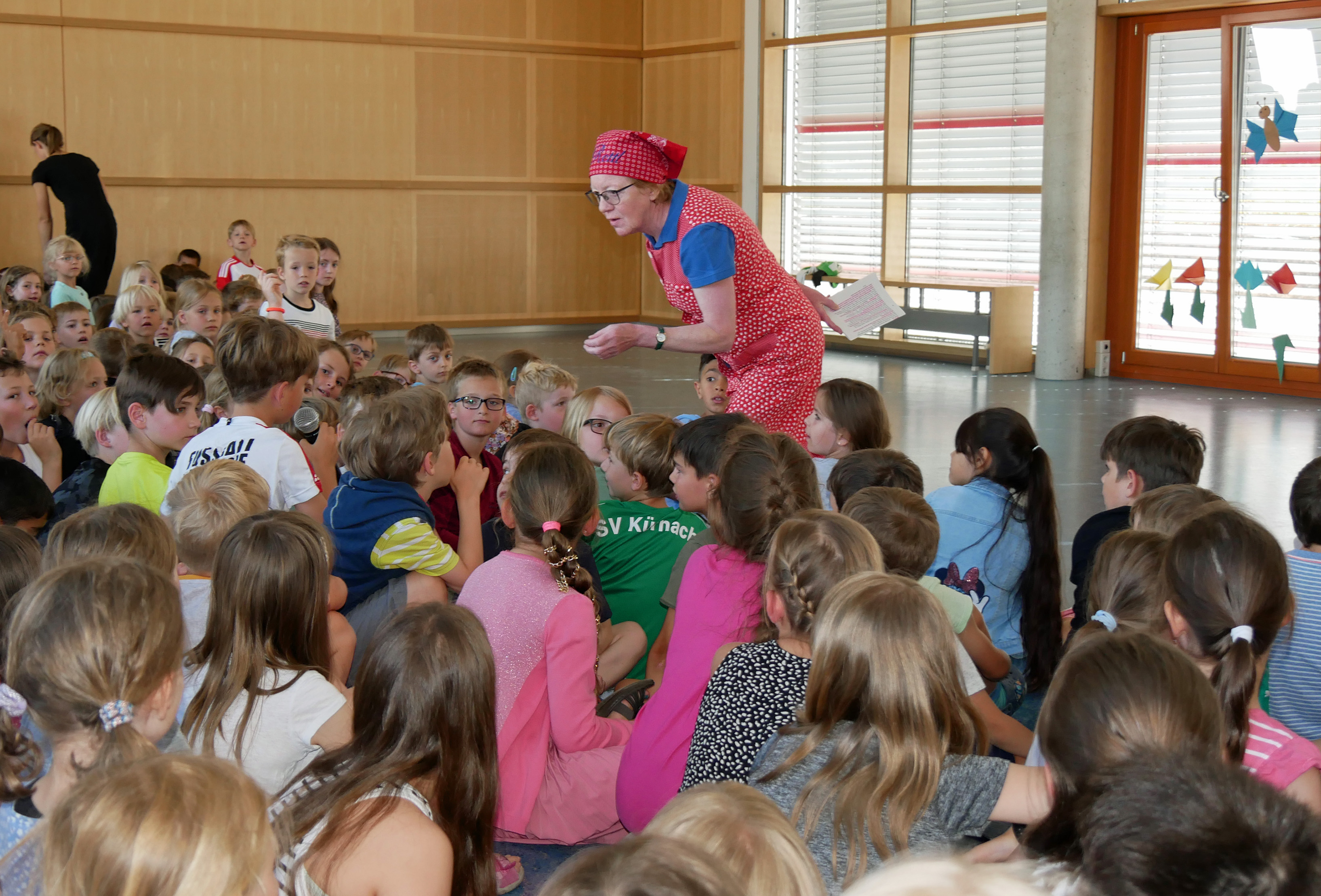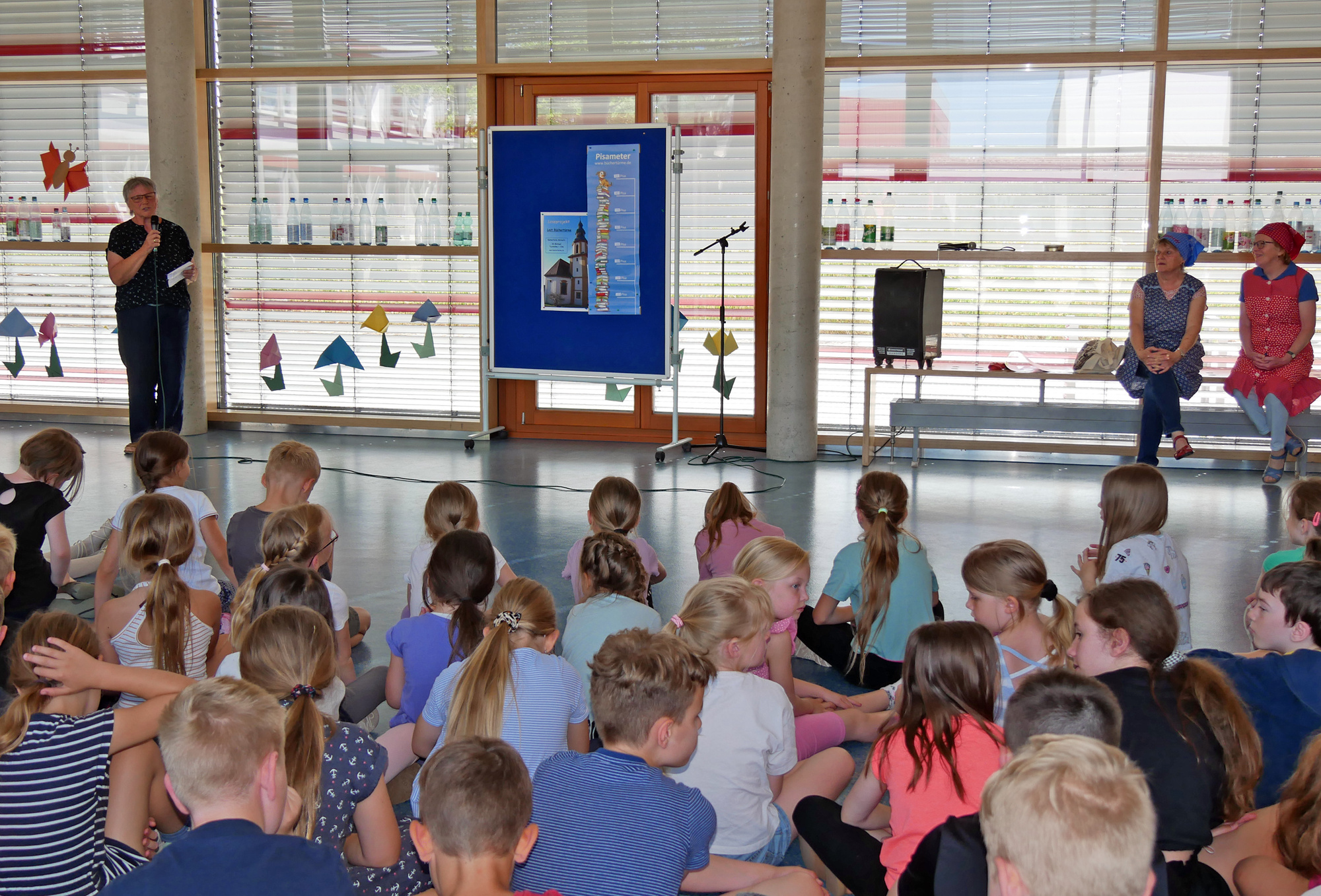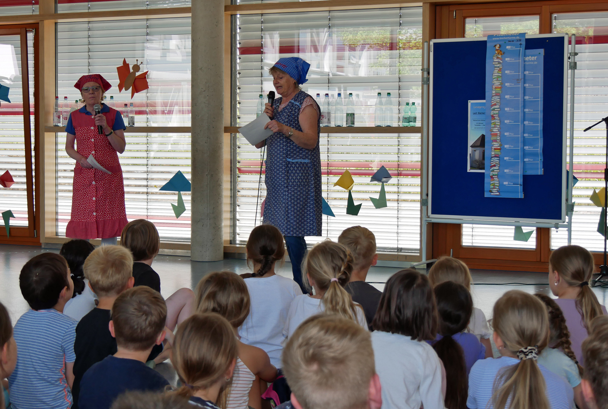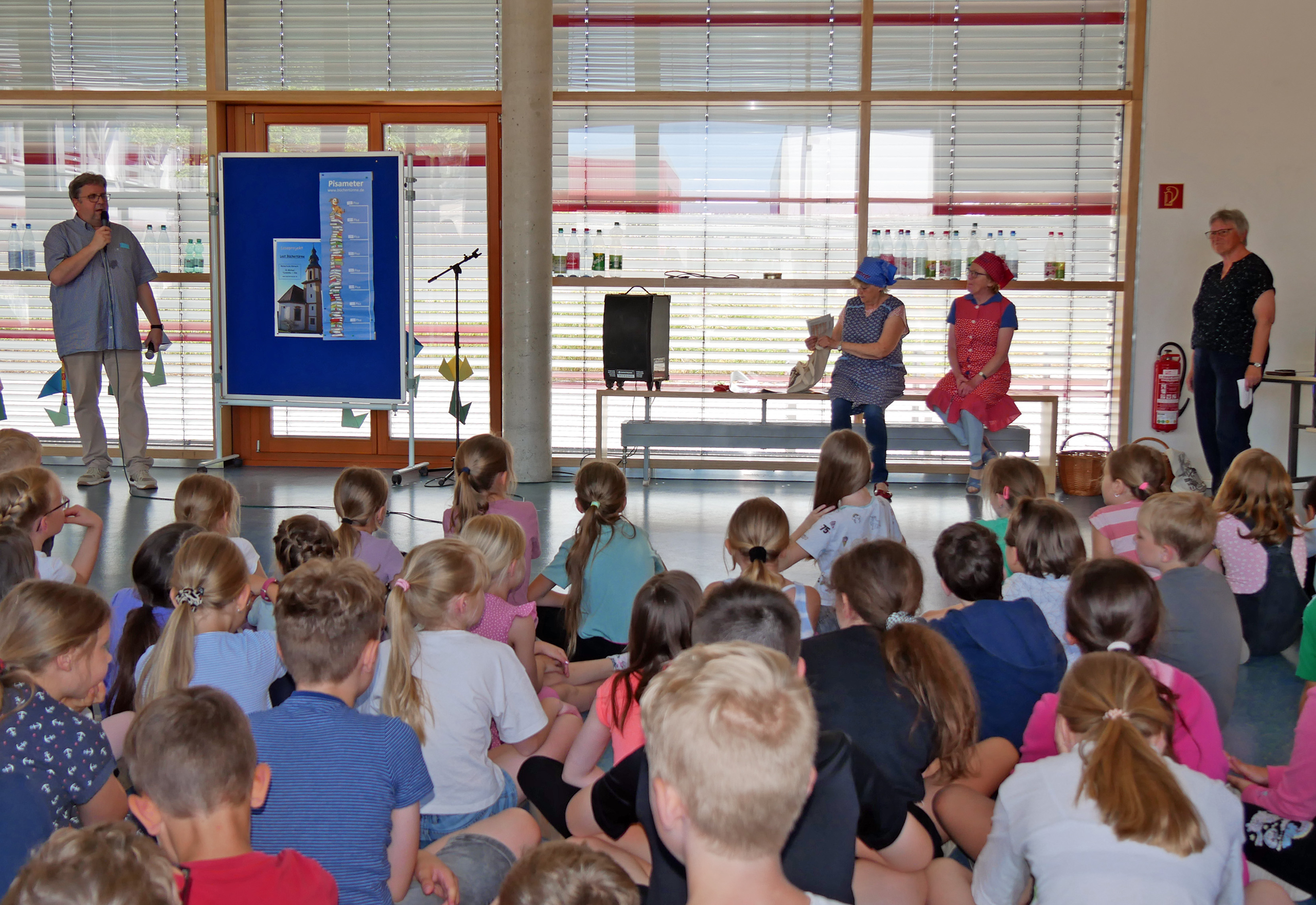 Richtig spannend war es beim Abschlusstag des Projekts zur Leseförderung. In der Aula der Grundschule Kürnach wollten nicht nur die Schülerinnen und Schüler wissen, ob ihr imaginärer Bücherturm so hoch wie der Kirchturm der Kürnacher Pfarrkirche geworden ist. Rektor Stefan Baumann begrüßte in der Aula Pfarrer Joachim Bayer, Bürgermeister René Wohlfart, Maria Bauer und weitere Frauen des Büchereiteams. Das Ergebnis präsentierten Irma Grümpel und Jutta Melzer vom Verein Kürnacher Geschichte(n), die als Rettl und Bawett gekommen sind.