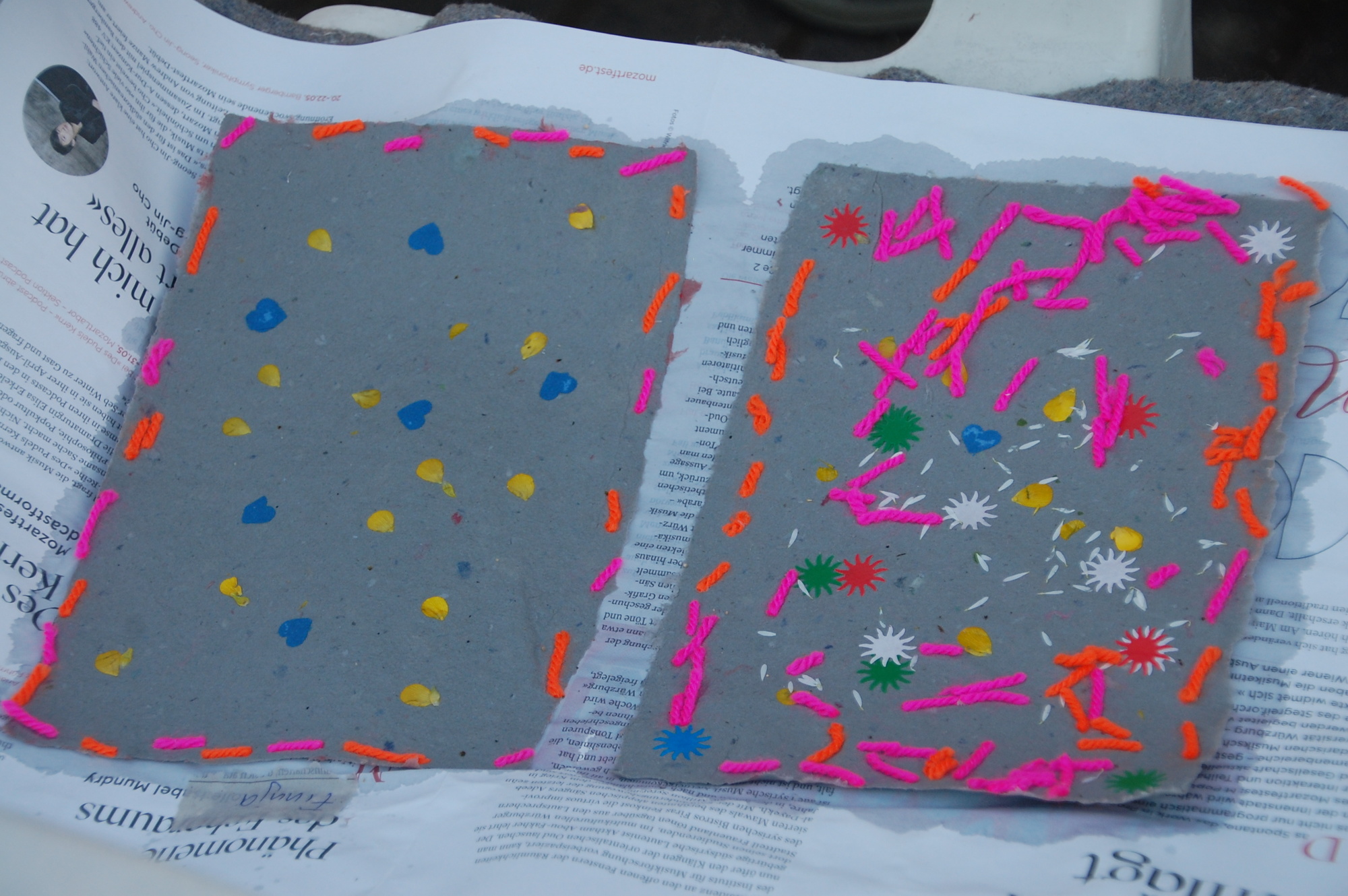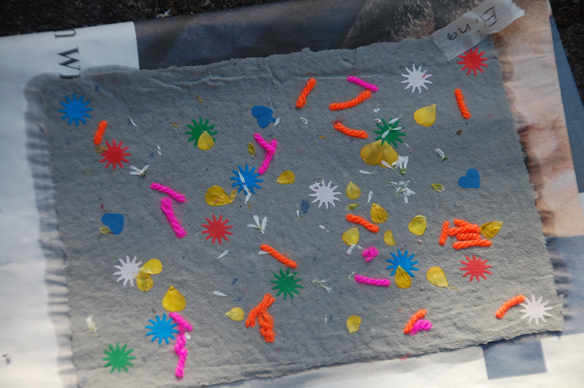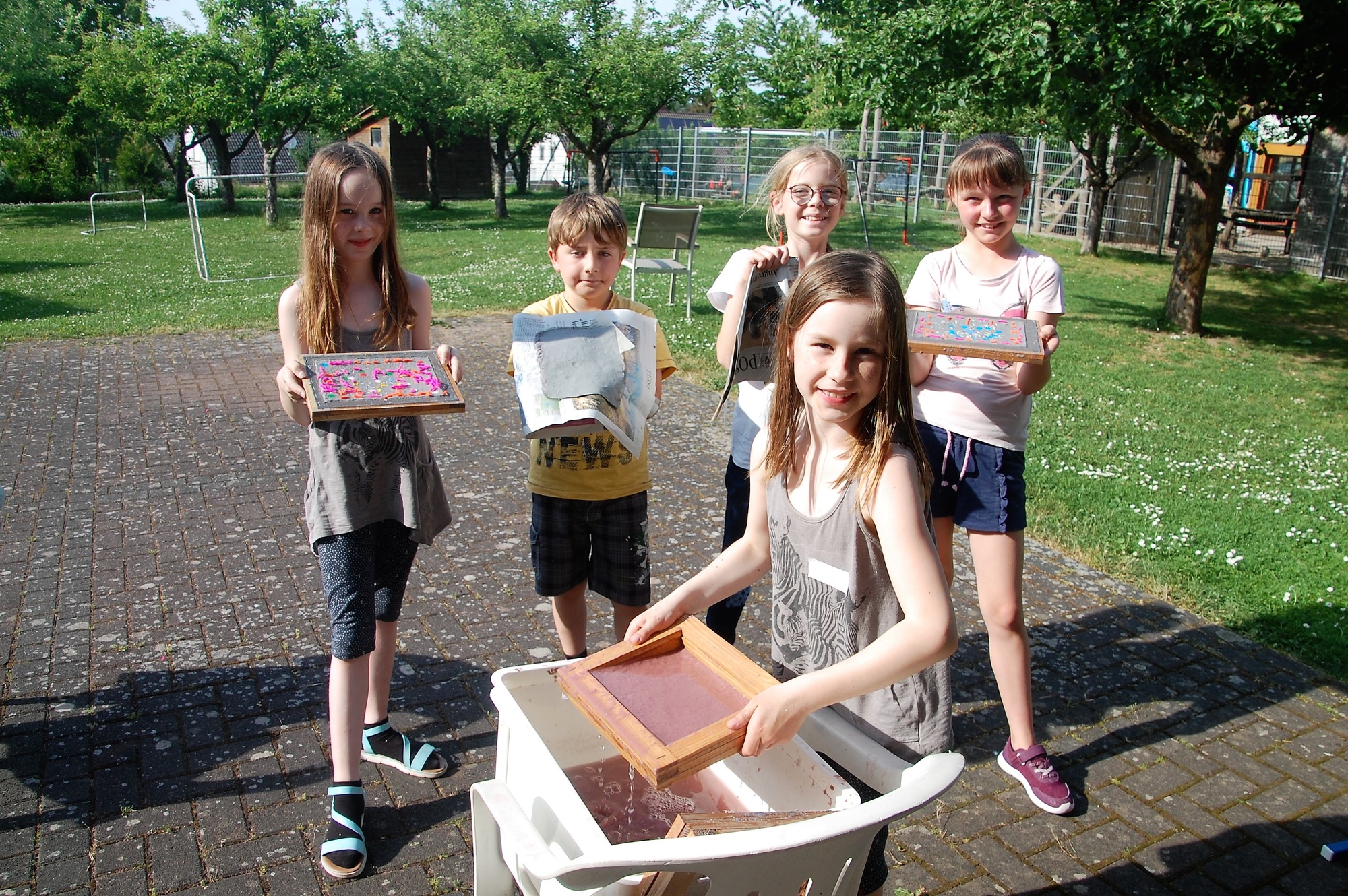 Im Pfarrgarten wurden alte Zeitungen unter Anleitung von Erhard Reiniger in kleine Schnipsel gerissen, dann mit Wasser vermischt und zu einer Pulpe gemixt. Mit einem Sieb und einem Rahmen konnten nun die Kinder von der Pulpe schöpfen, die Verzierungen mit verschiedenen Materialien aufbringen und dann auf eine Filzunterlage stürzen. Anschließend wurde fleißig am Schraubstock gedreht, um das Wasser aus dem geschöpften Papier zu pressen. Unterstützt wurden sie dabei von den Büchereimitarbeiterinnen Gisela Bach und Roswitha Schmidt. Nun mussten die Kunstwerke nur noch in der Sonne trocknen und konnten dann mit nach Hause genommen werden.