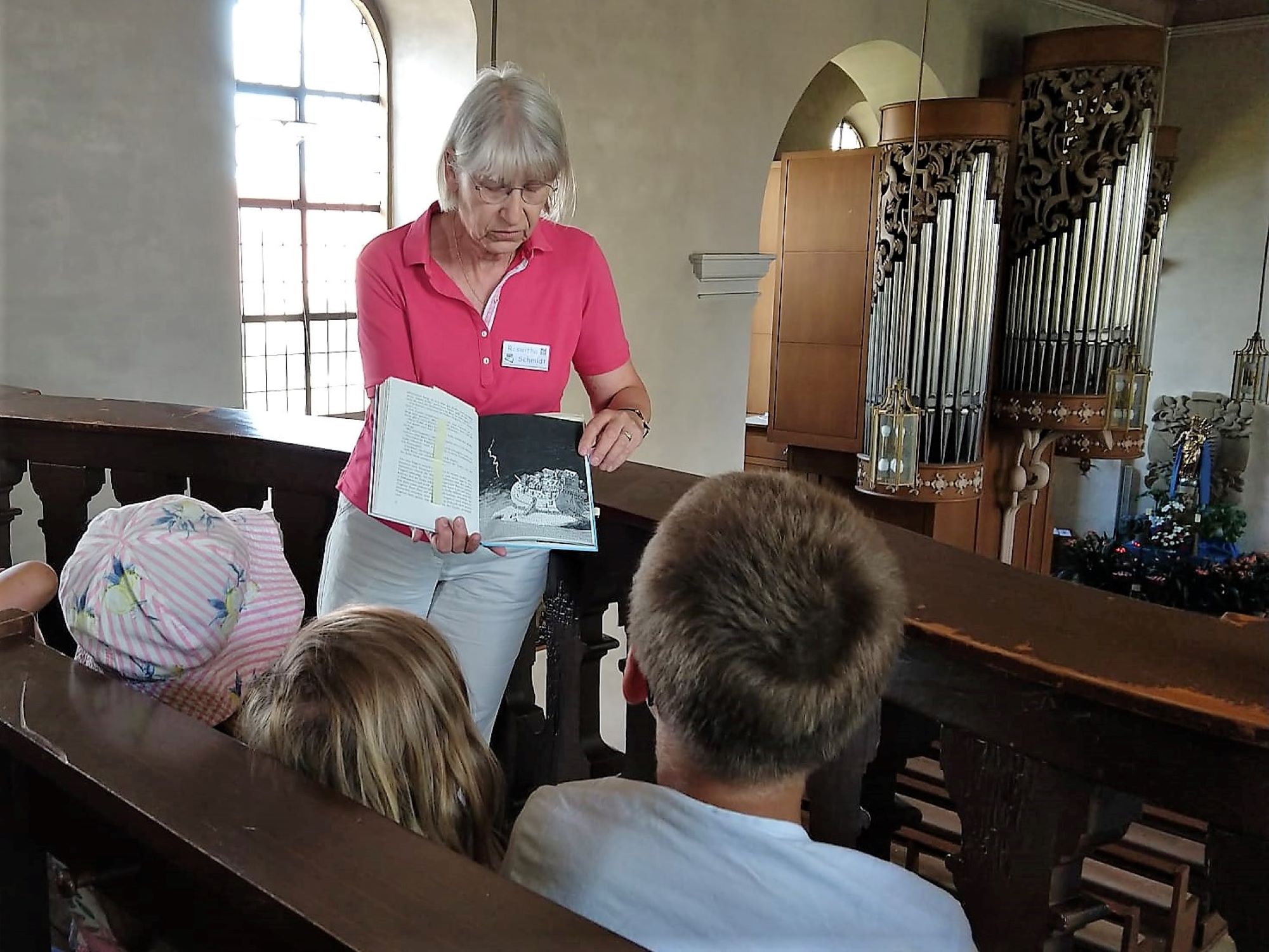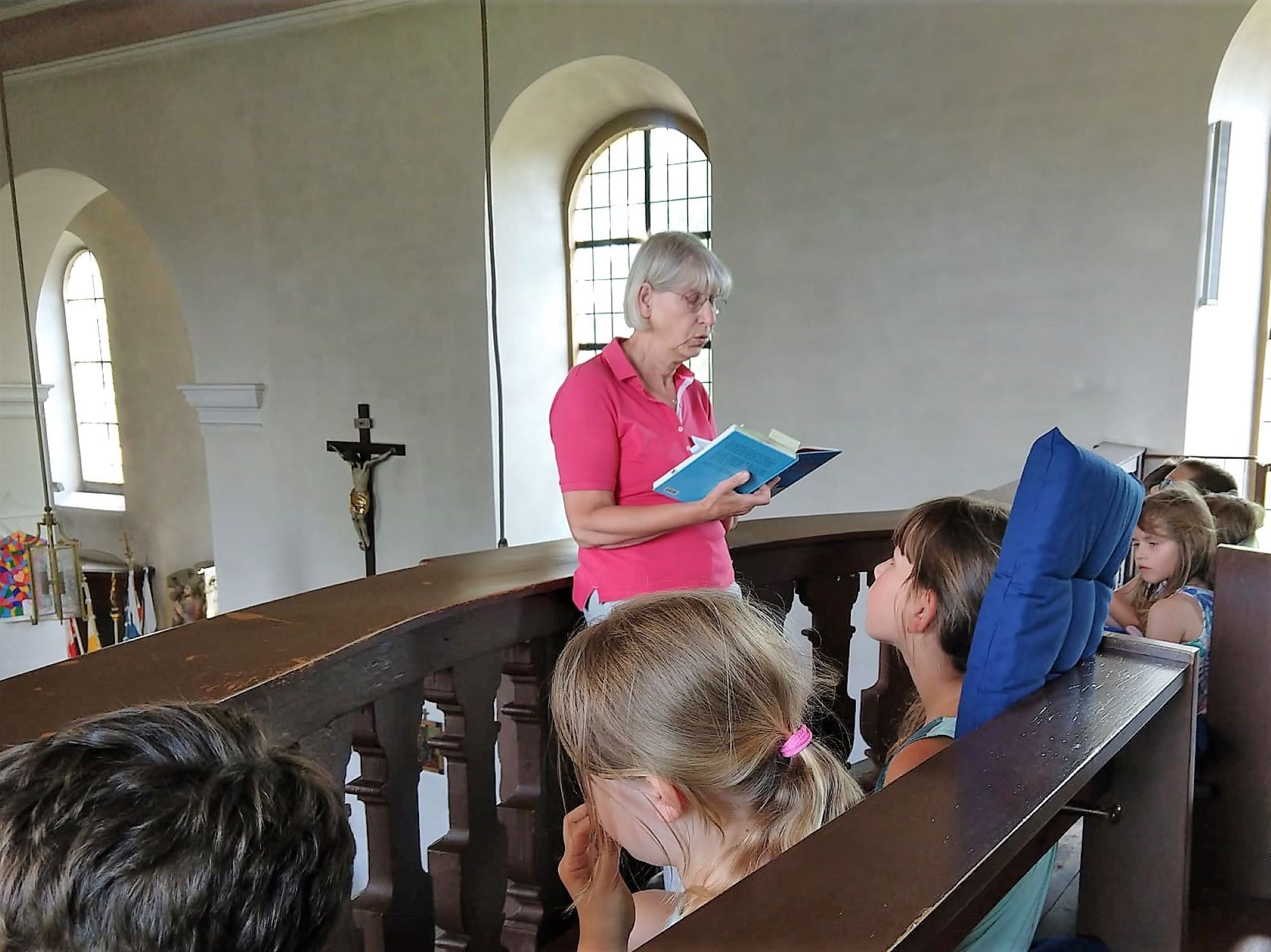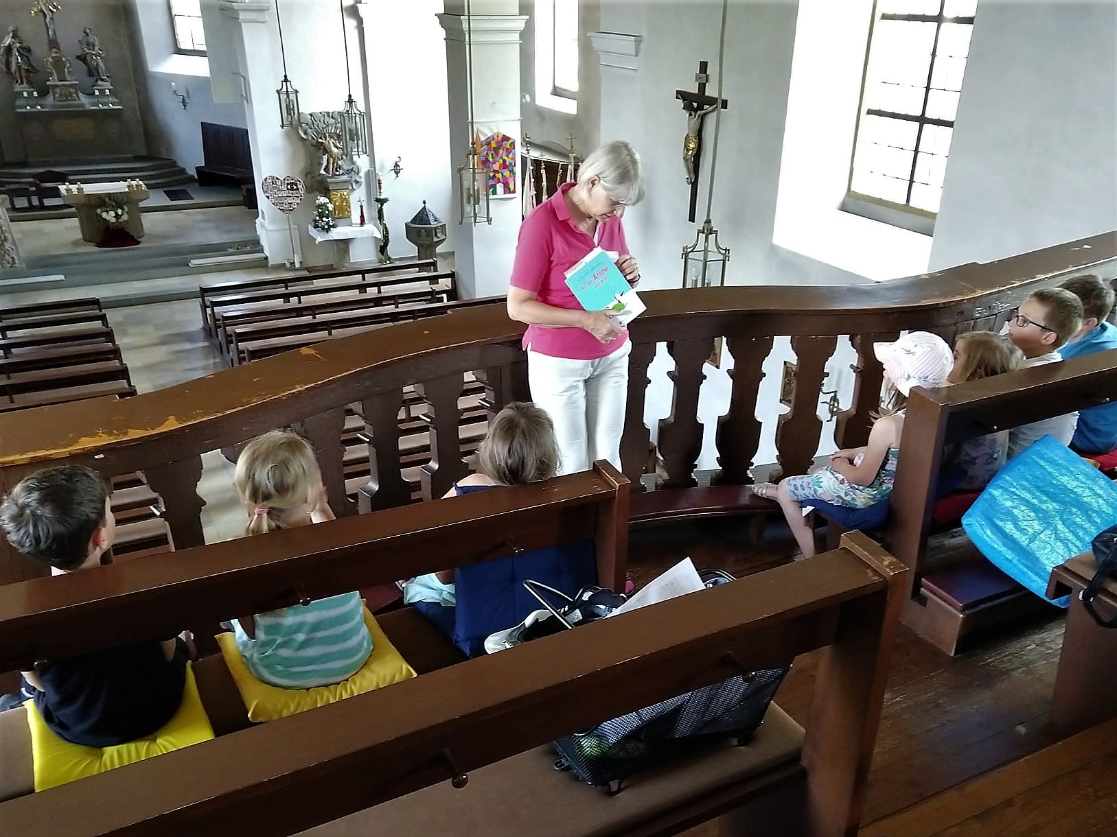 Äußerst aufmerksam und gespannt lauschten die Kinder dieser Geschichte. Zum Abschluss besuchte die kleine Zuhörerrunde das Standbild des Erzengels Michael neben dem Altar. Auch St. Michael, der Pfarrpatron der Gemeinde, sollte das Böse, dargestellt durch den Drachen, mit dem Flammenschwert abwehren.