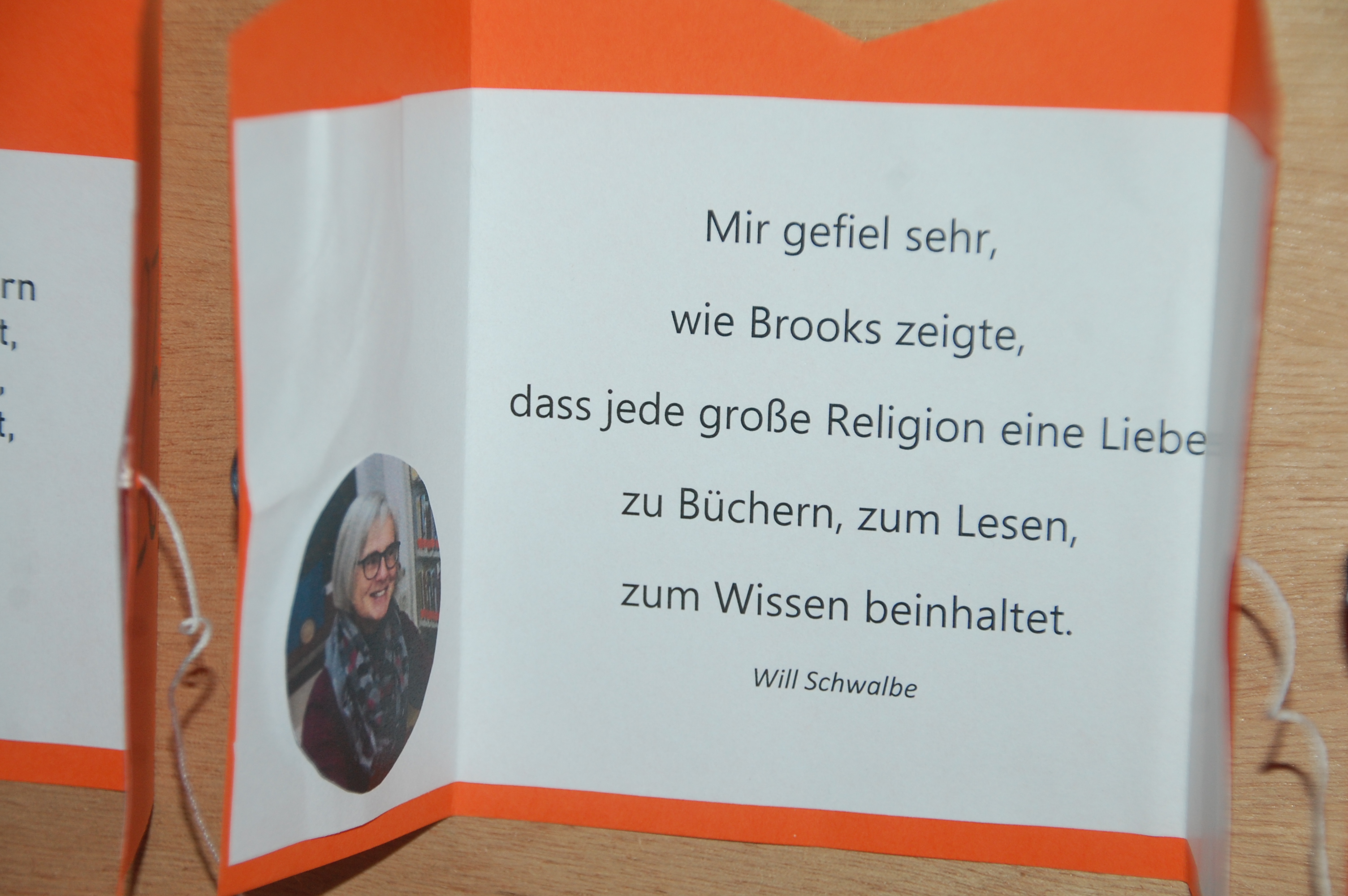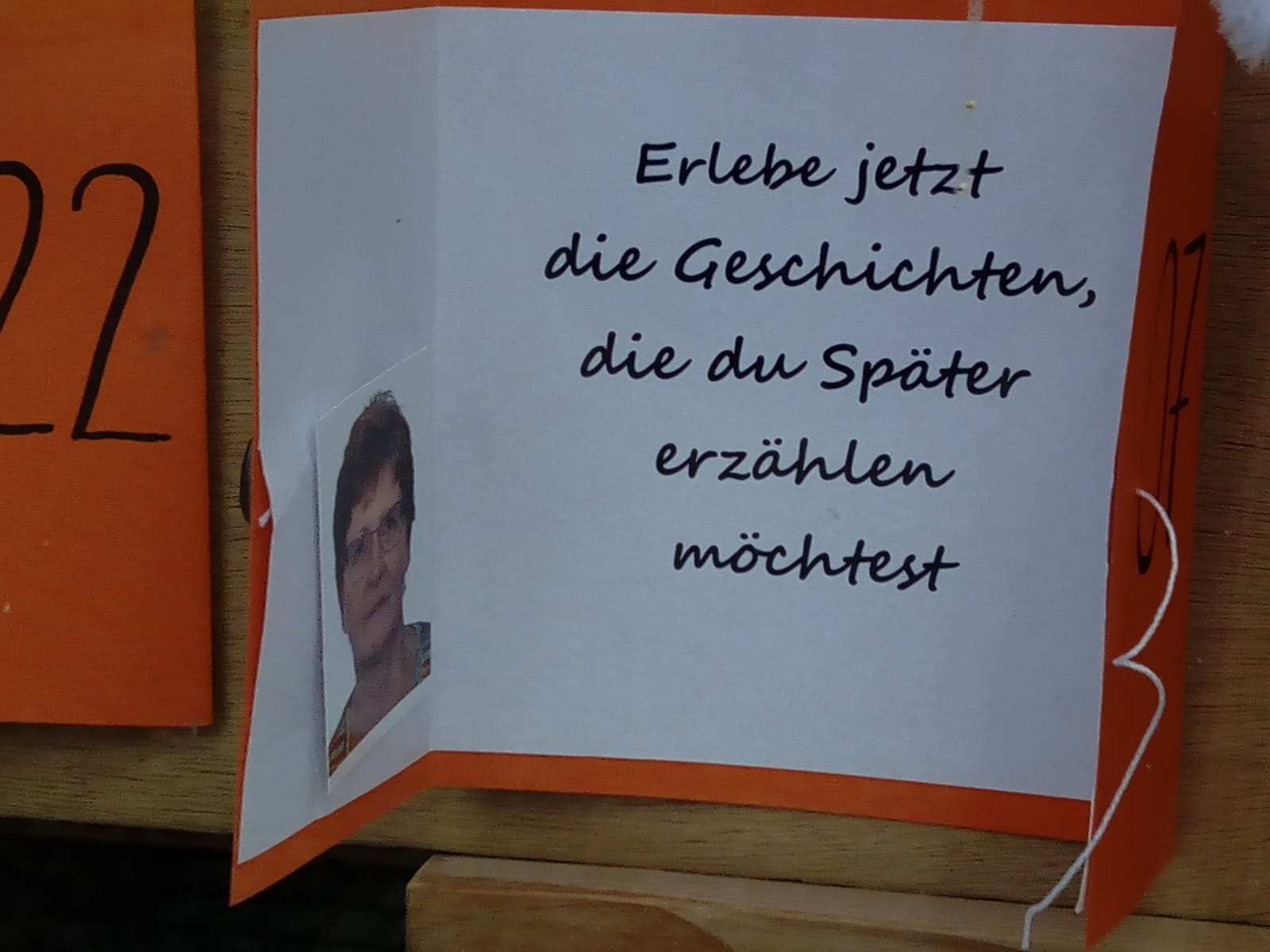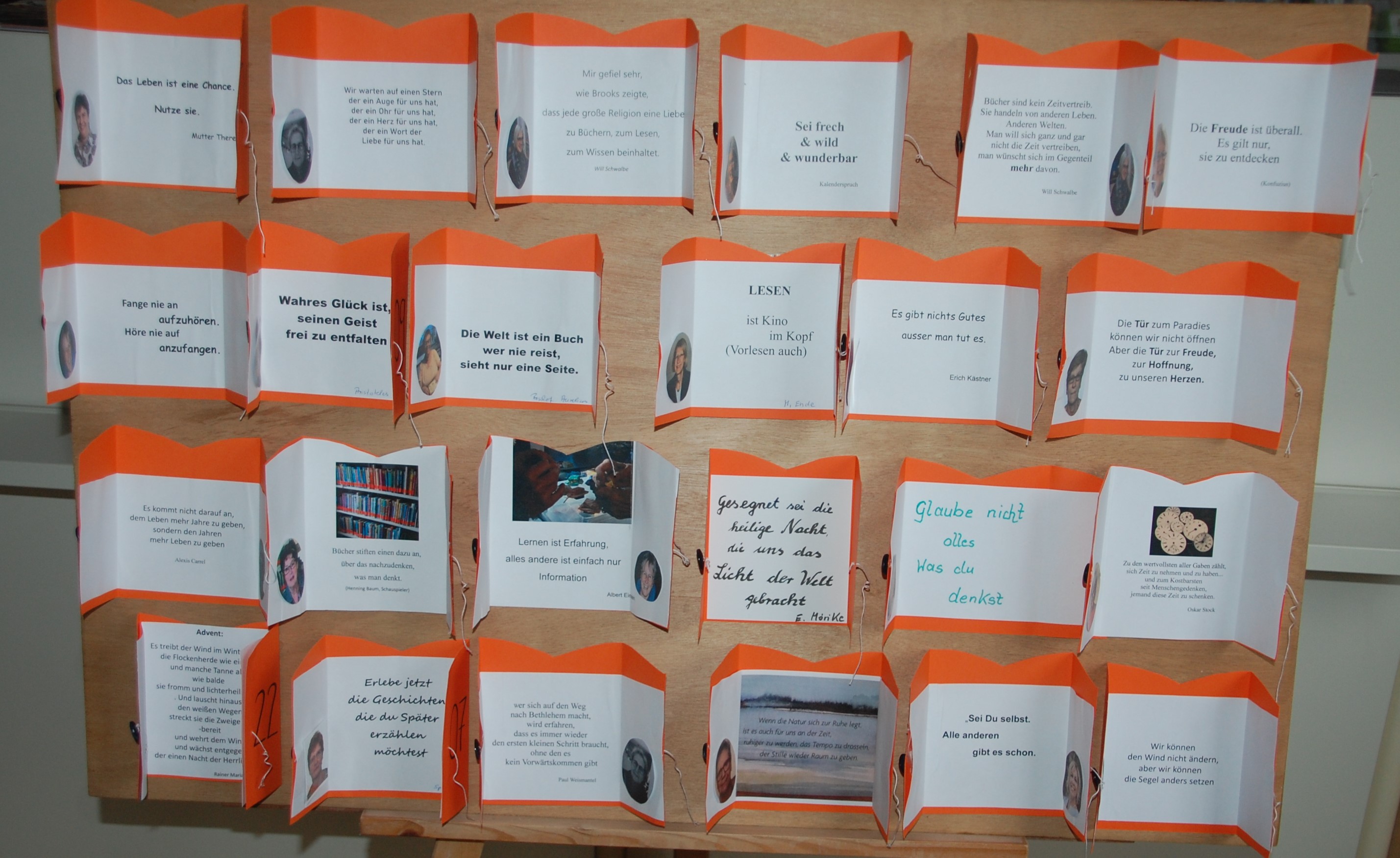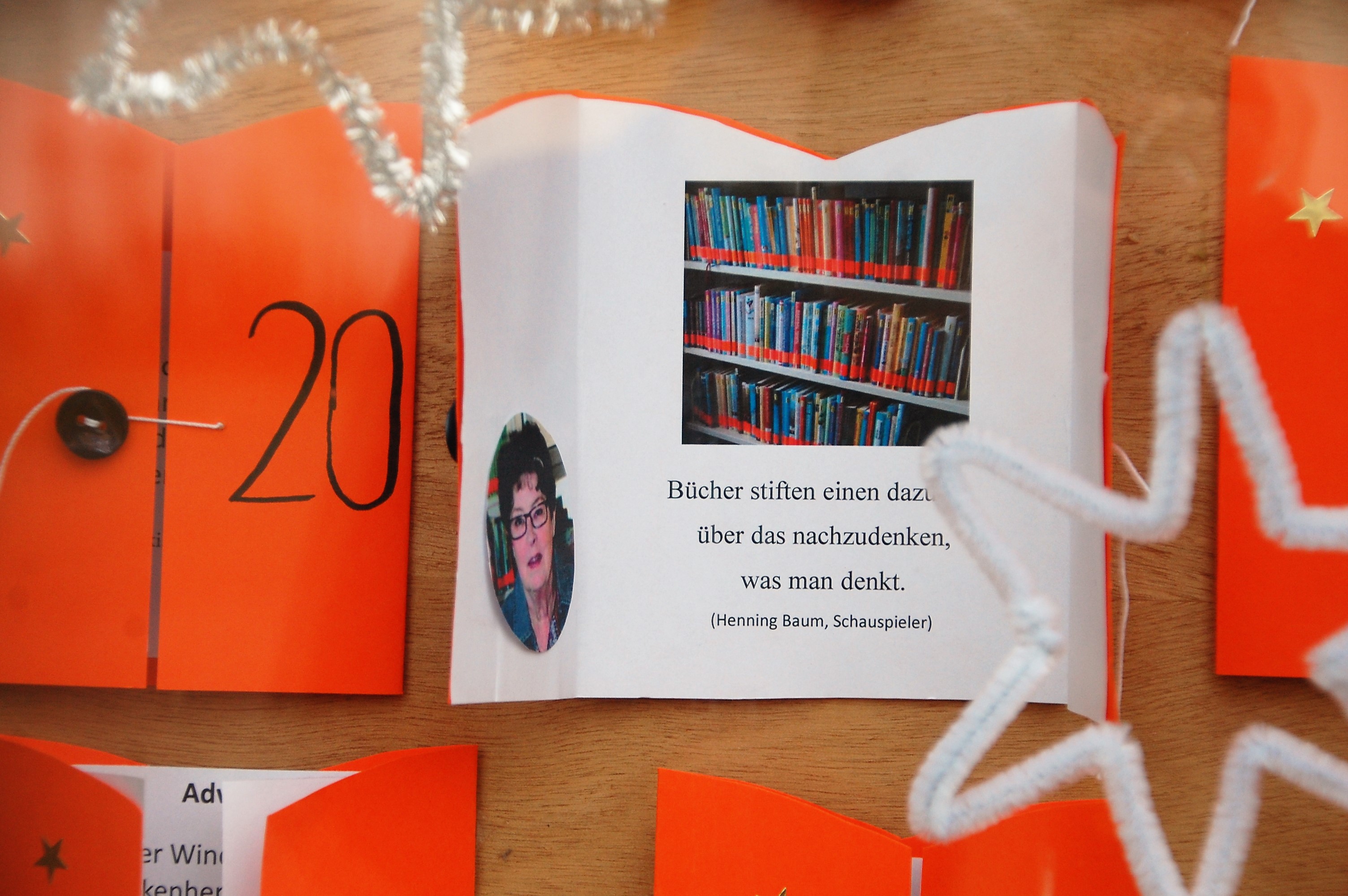 Ein Text von einer bekannten oder auch weniger bekannten Persönlichkeit fand sich hinter jedem Türchen, jeweils ausgesucht von einer Mitarbeiterin der Bücherei. Bei einem Besuch der Bücherei oder einem Spaziergang zum Kirchberg konnte man sich von den verschiedenen Texten inspirieren lassen.