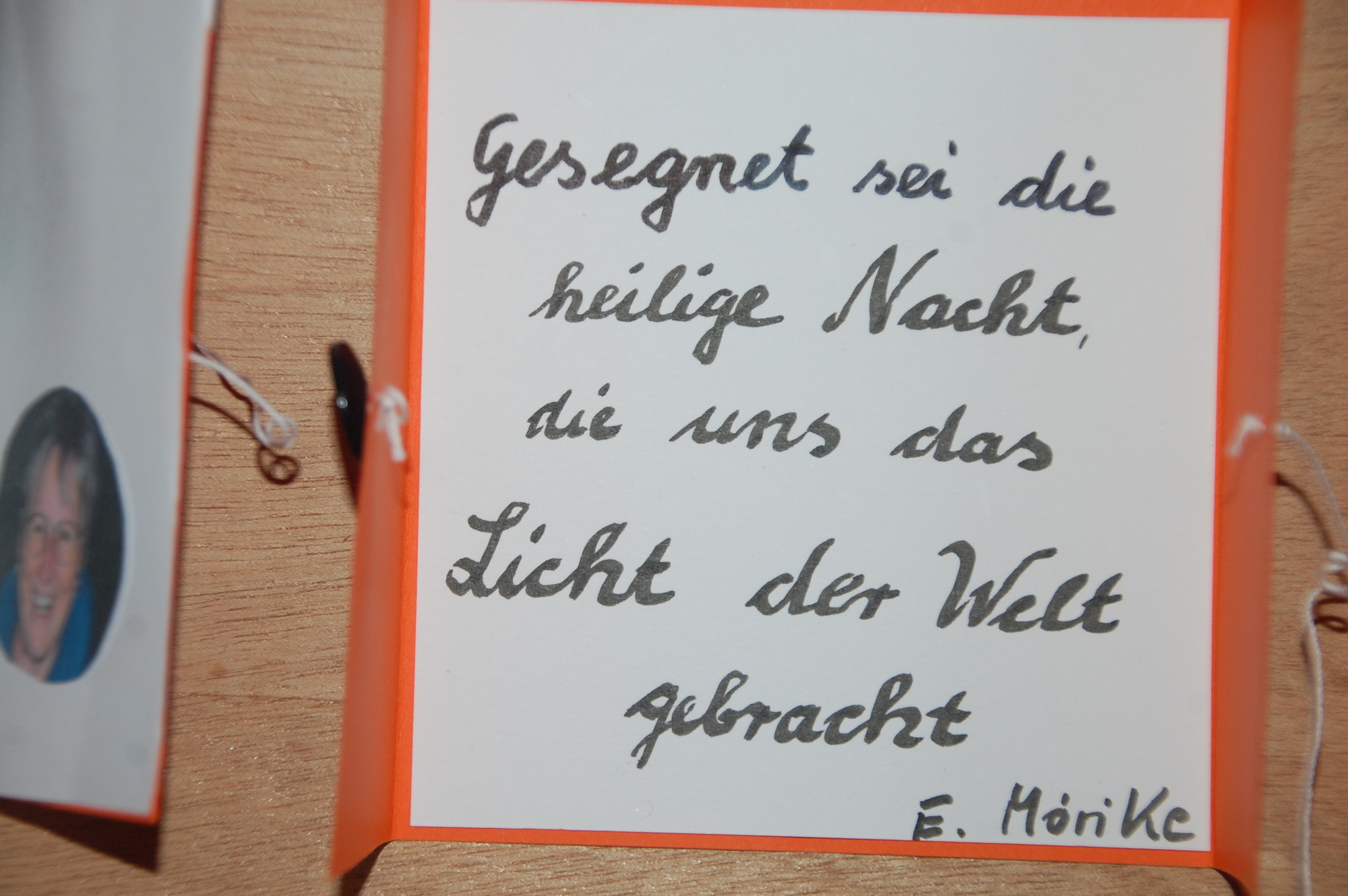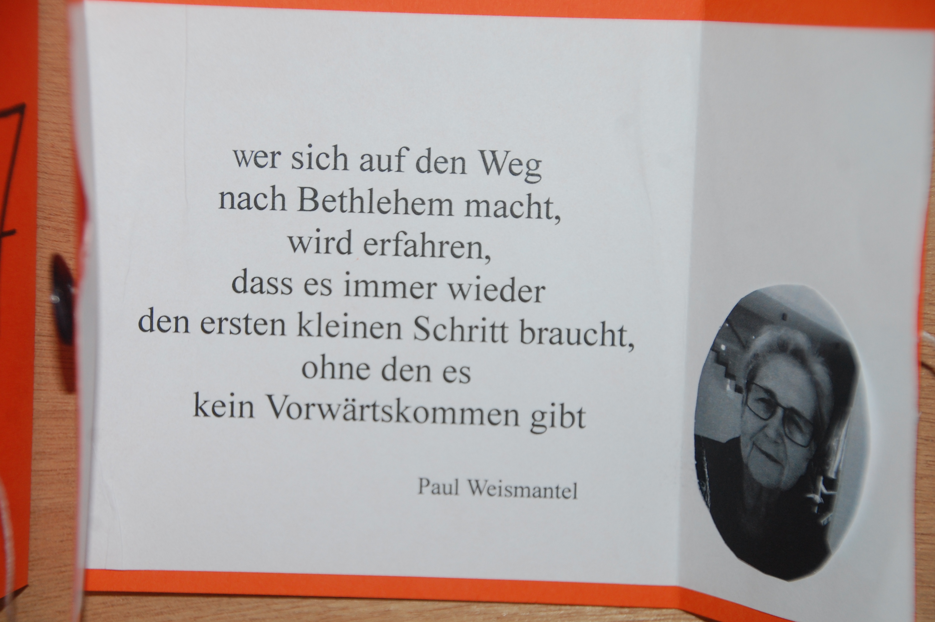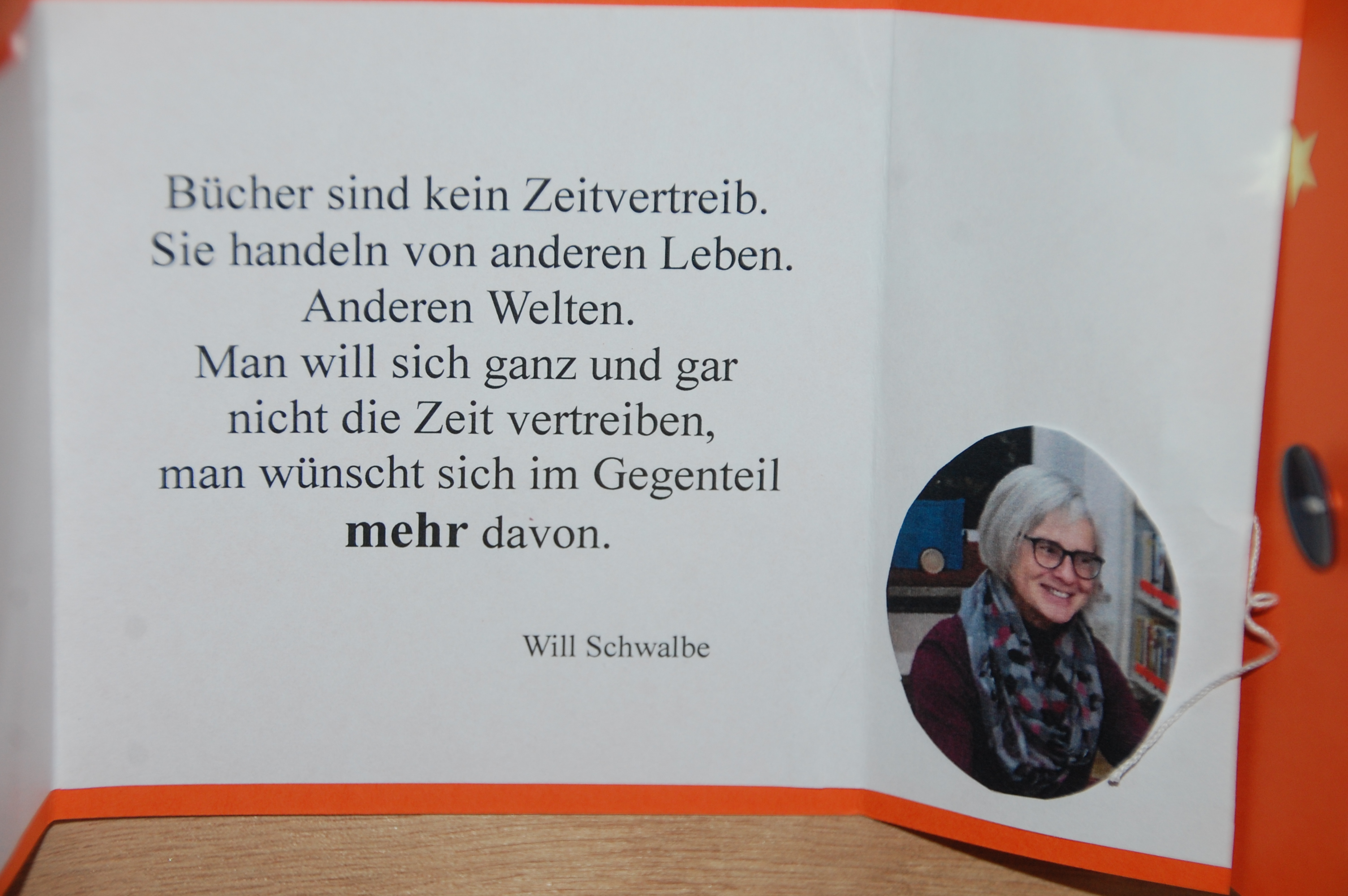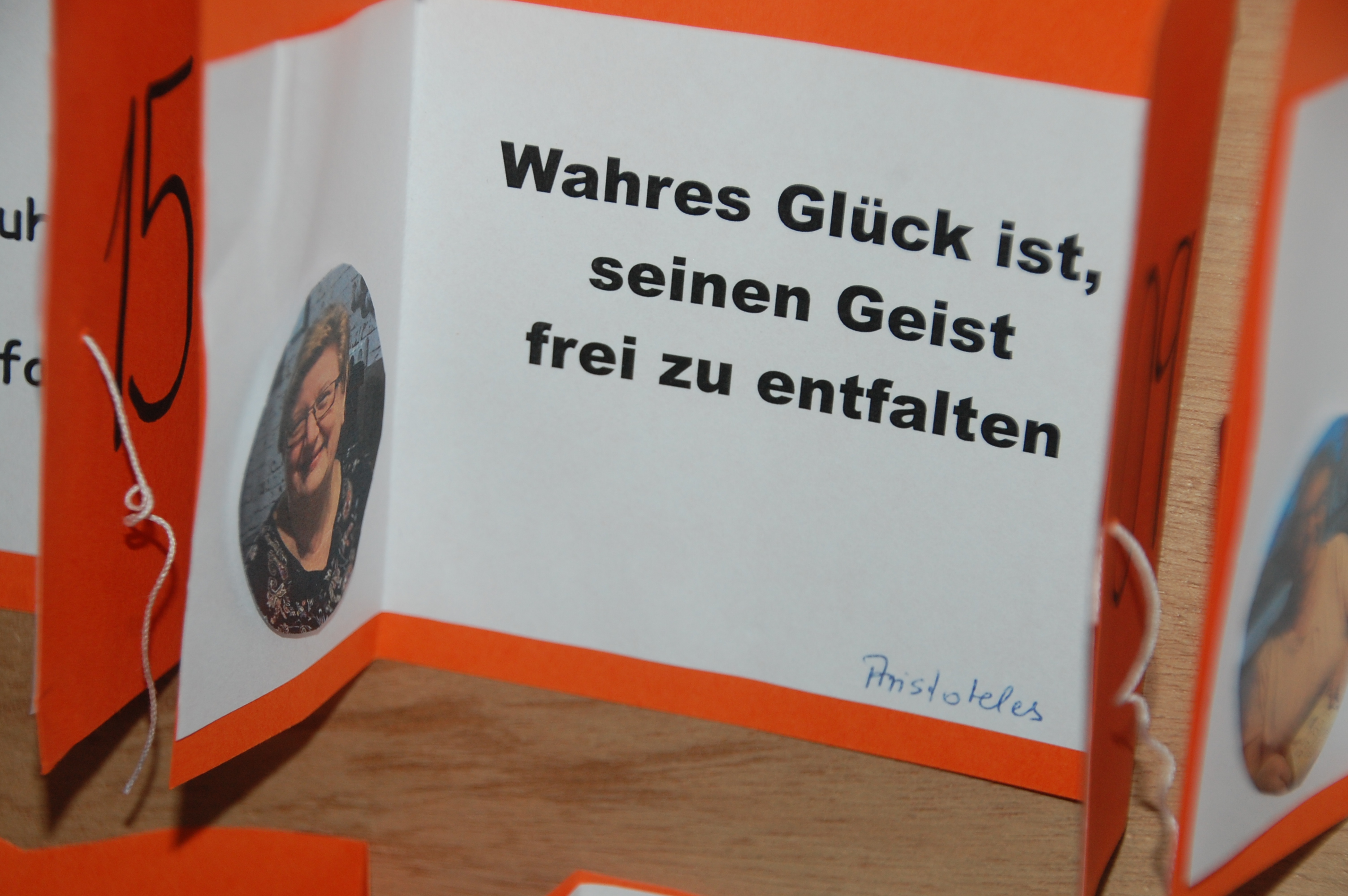 Ein Text von einer bekannten oder auch weniger bekannten Persönlichkeit fand sich hinter jedem Türchen, jeweils ausgesucht von einer Mitarbeiterin der Bücherei. Bei einem Besuch der Bücherei oder einem Spaziergang zum Kirchberg konnte man sich von den verschiedenen Texten inspirieren lassen.
