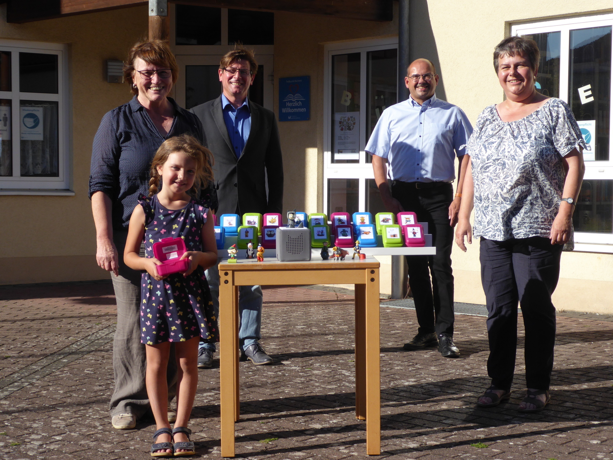 Was früher der Kassettenrecorder und Kassetten waren, sind heute Toniebox und Tonies. Über dieses neue digitale Medium informierten sich Pfarrer Joachim Bayer und Bürgermeister René Wohlfart bei einem Besuch in der Bücherei und ließen sich von Büchereileiterin Heidi Heinrich die praktische Anwendung zeigen. Dank der finanziellen Unterstützung durch das Förderprogramm für Kleinprojekte von ILEK Würzburger Norden konnten eine Toniebox und 50 Tonies eingestellt werden. Mit diesem neuen Hör-Spiel-Spaß zum Anfassen hat die Bücherei Kürnach ein weiteres attraktives Angebot für Klein- und Grundschulkinder. Ab sofort können diese Tonies für jeweils zwei Wochen kostenlos ausgeliehen werden.