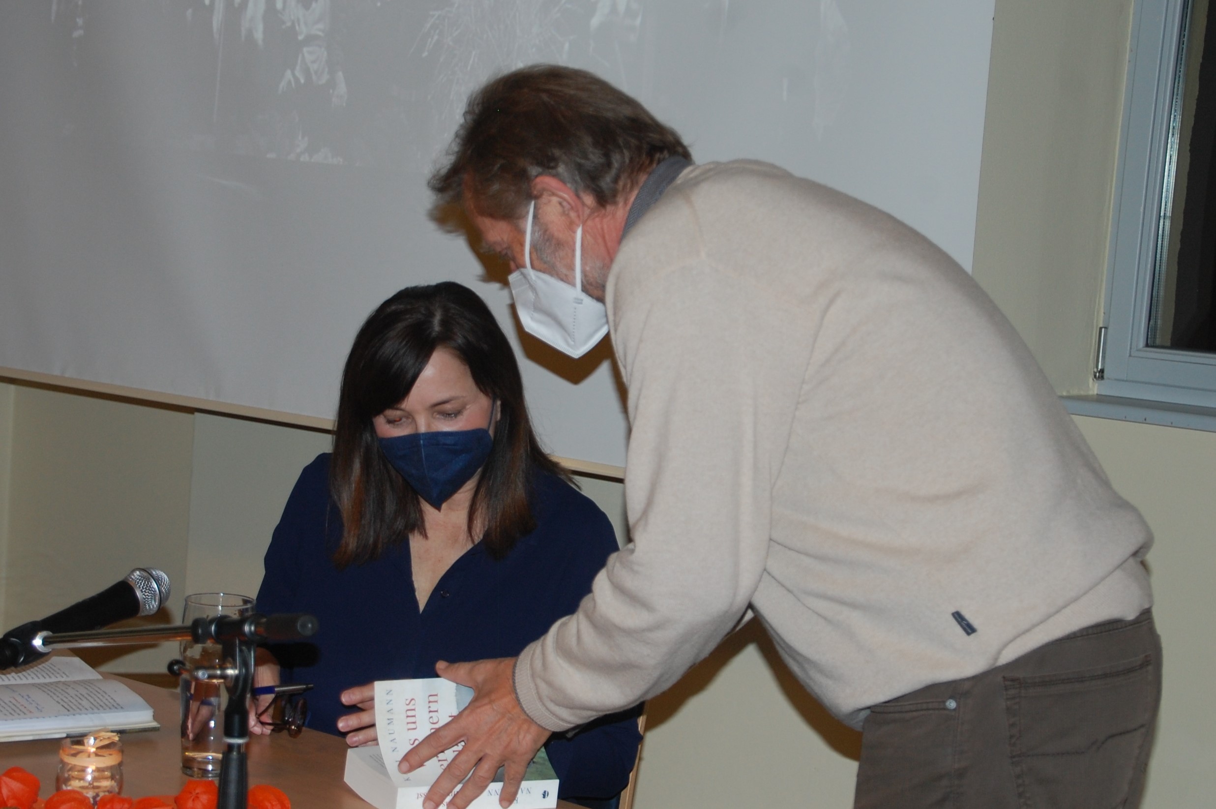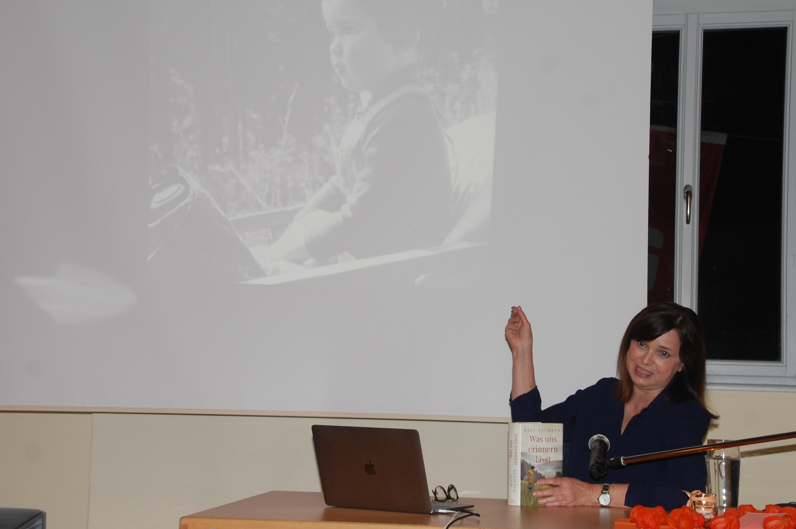Eindrucksvoll erzählte Kati Naumann wie die Idee zu „Was uns erinnern lässt“ in ihr reifte. In Leipzig geboren, war sie als Kind oft bei ihren Großeltern in Sonneberg, das im Grenzgebiet der ehemaligen DDR lag. In vielen Gesprächen mit Freunden, Wanderungen im Thüringer Wald und Recherchen in Archiven hat sie sich mit dem Leben der letzten Jahrzehnte in diesem Sperrgebiet beschäftigt. Zwischen den einzelnen Passagen, die Kati Naumann aus ihrem Buch liest, lässt sie Immer wieder Episoden aus ihrem Leben einfließen, viele auch bebildert.