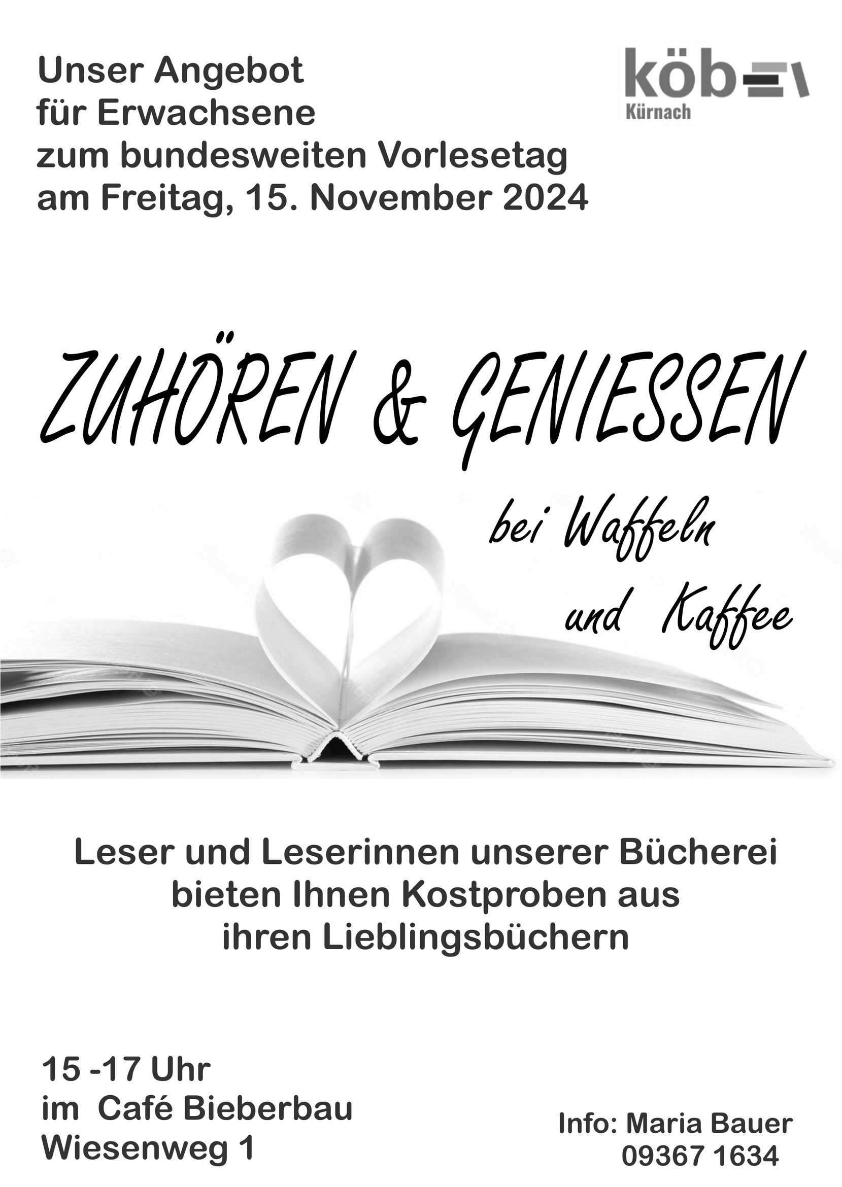 Der trübe und düstere Novembertag lud geradezu ein, sich im Cafe Bieberbau in Kürnach mit Waffeln und Kaffee einen gemütlichen Nachmittag zu machen. Eingeladen hatte die Bücherei Kürnach, deren MitarbeiterInnen Bücher vorstellten und daraus vorlasen. So unterschiedlich wie die Akteure, so verschieden waren auch die Buchthemen. Die Besucherinnen und Besucher hörten aus “Gussie“ vom Leben der zweiten Frau Adenauers, verschiedene Episoden aus „Die langen Abende“, sie erfuhren von Bräuchen und Regeln orthodoxer Juden in „ Die Hochzeit der Chani Kaufmann“. Einen Einblick in den Jemen mit seinem Kaffeeanbau vermittelte der „ Mönch von Mokka“, zum Nachdenken über das Leben regte das Buch „25 letzte Sommer“ an. Mit viel Applaus bedankten sich die Gäste für den informativen und gemütlichen Lesenachmittag.